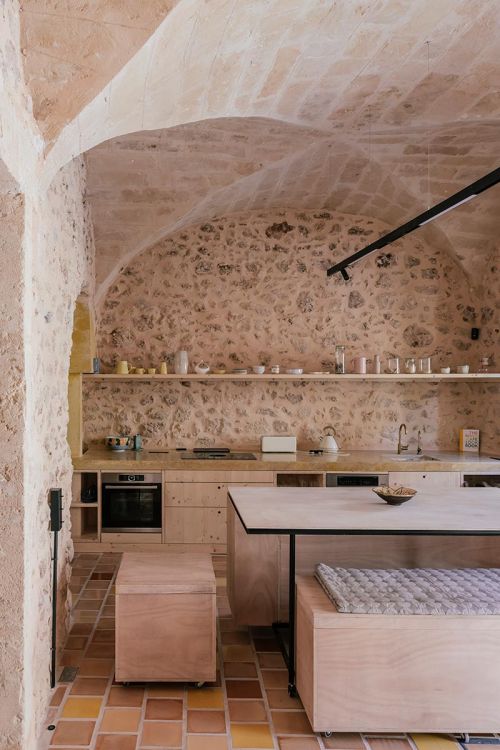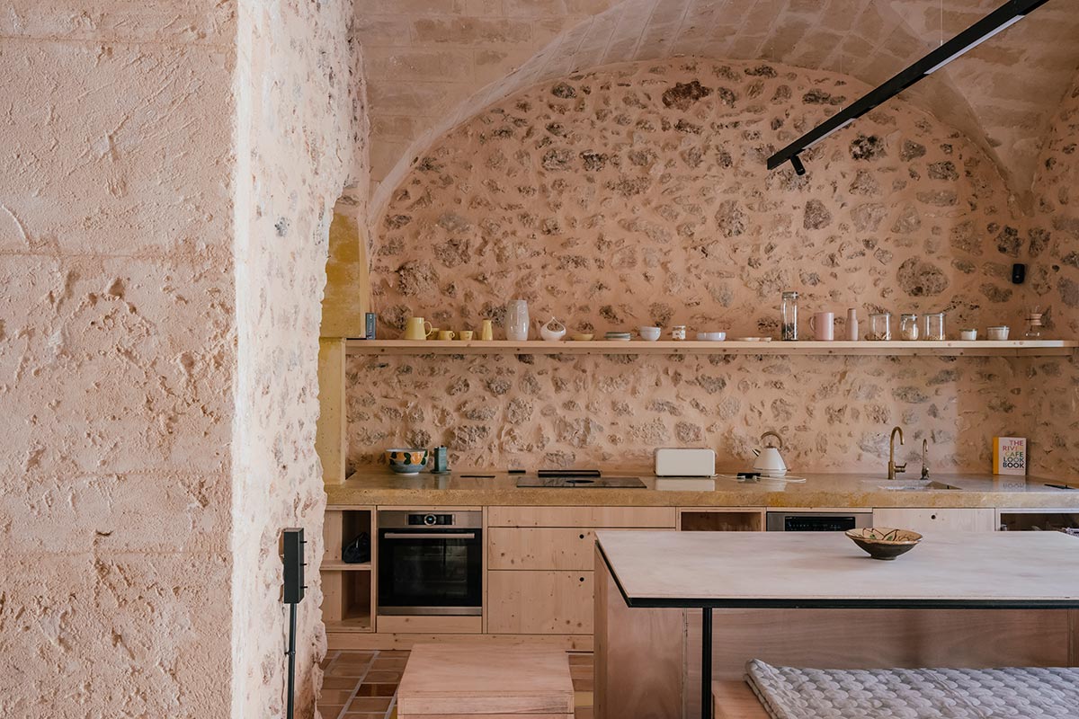 Destaquen els tiradors integrats directament al frontal, amb una forma rodona i subtil, pensats per no perdre l’harmonia del disseny. Els electrodomèstics amb acabats en inox i la griferia de llautó raspallat completen aquesta cuina, combinant modernitat i estil amb materials naturals.