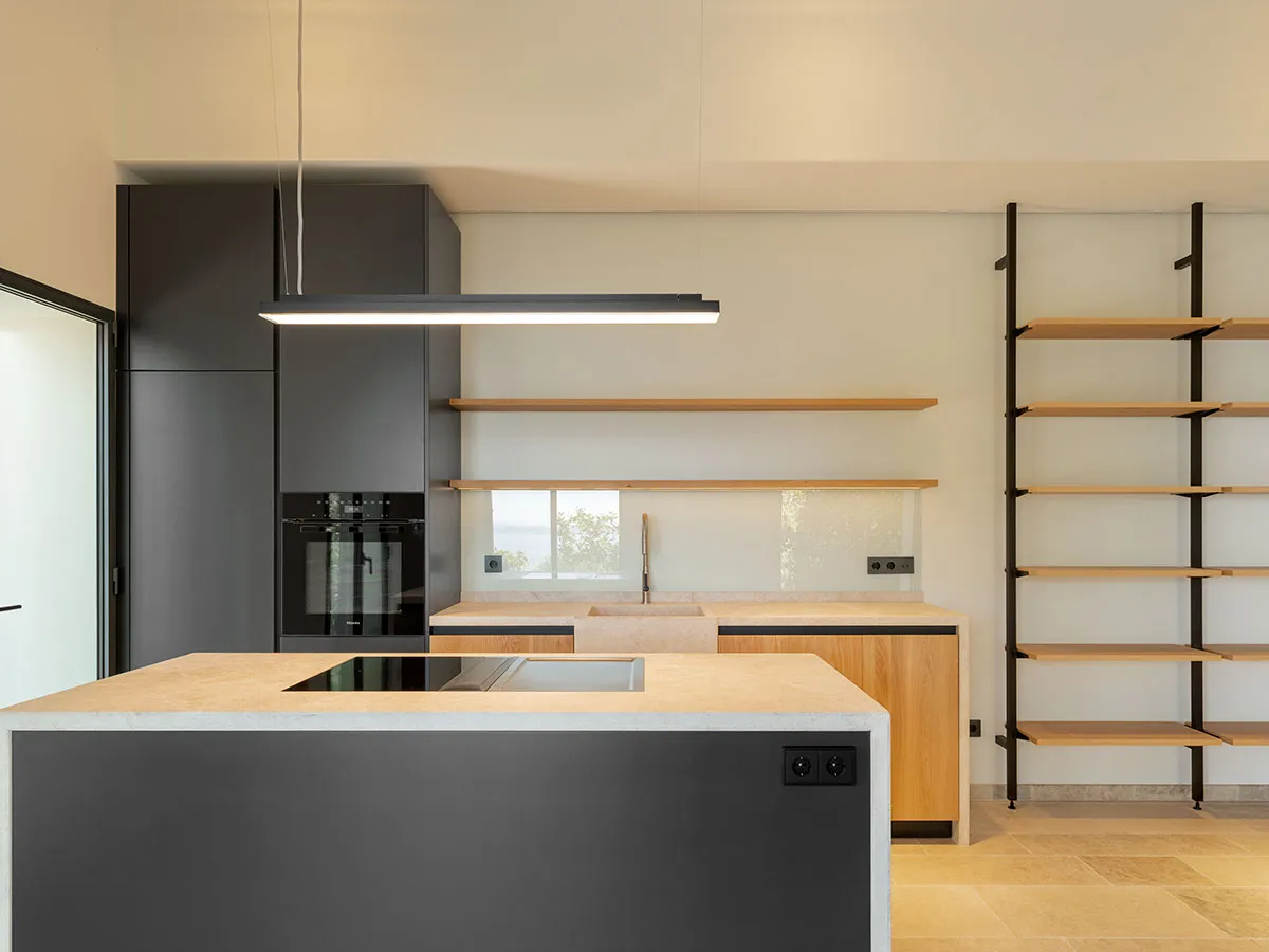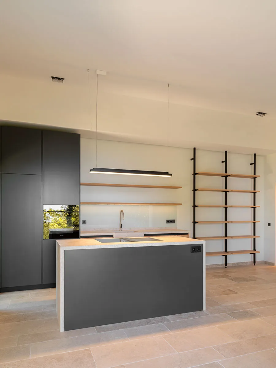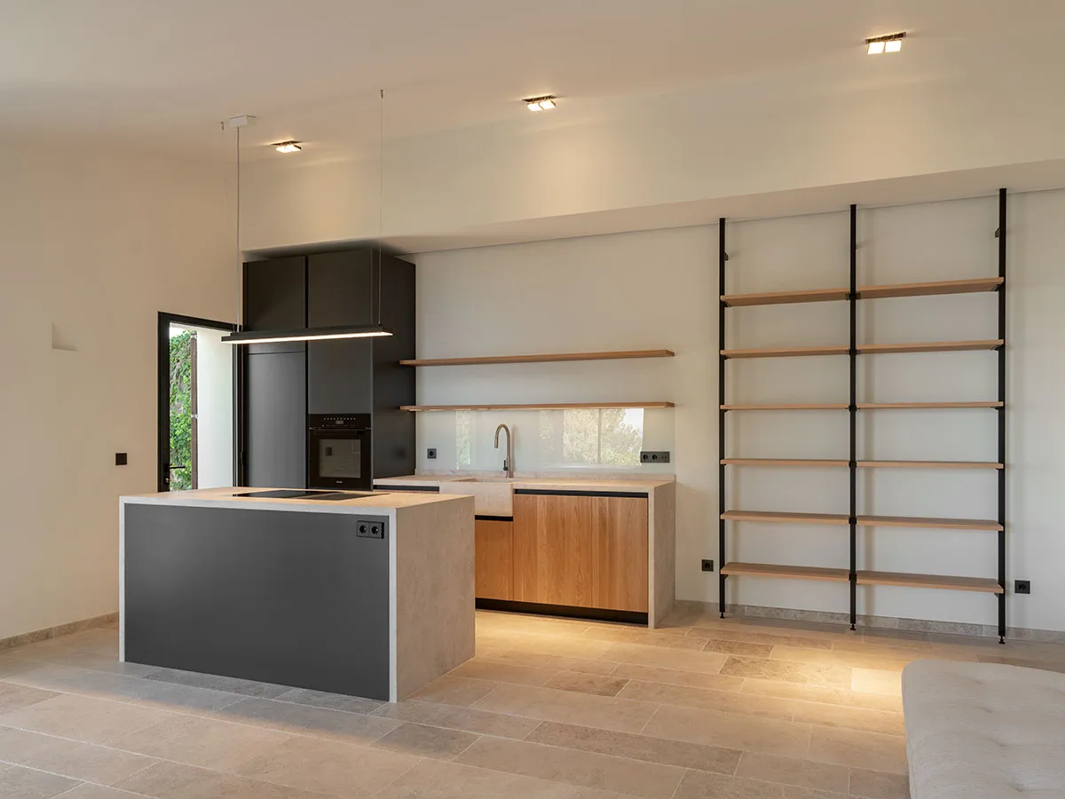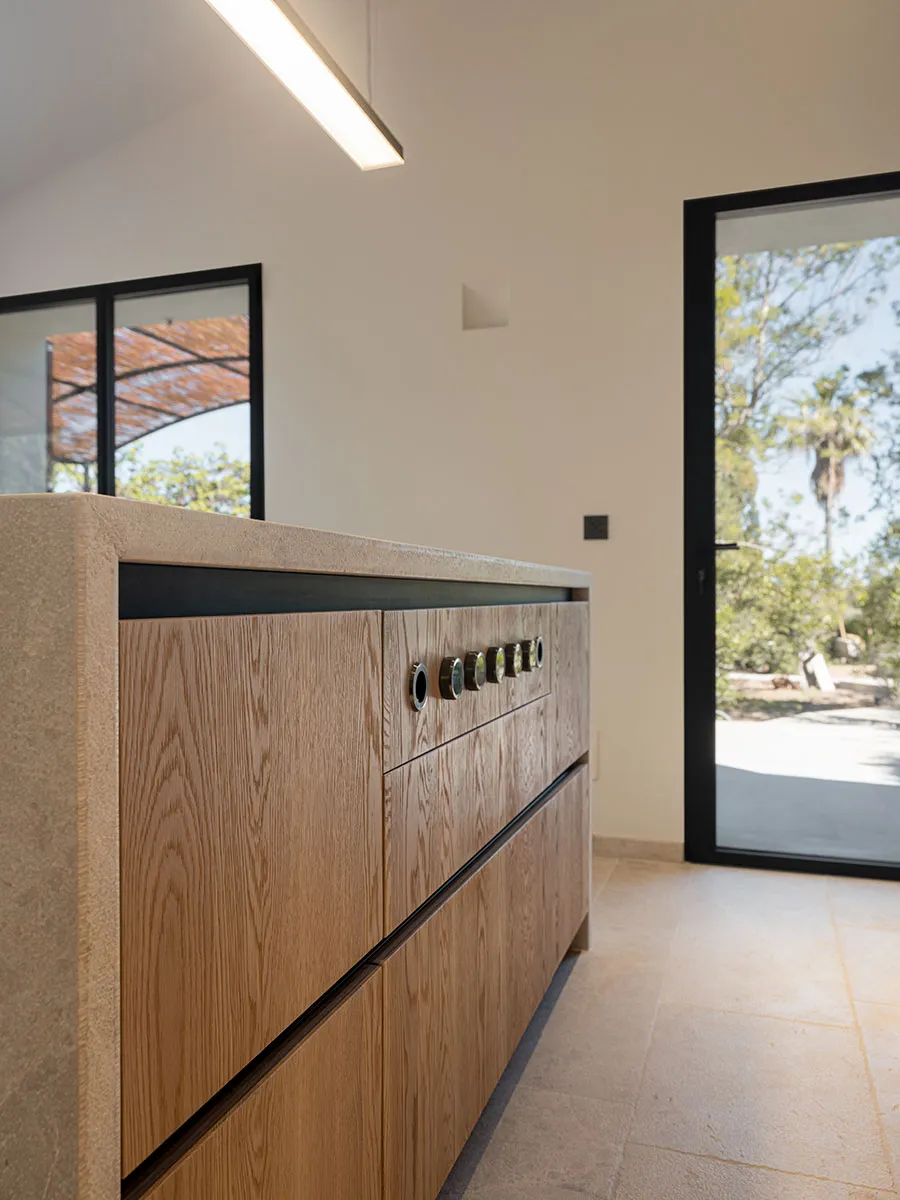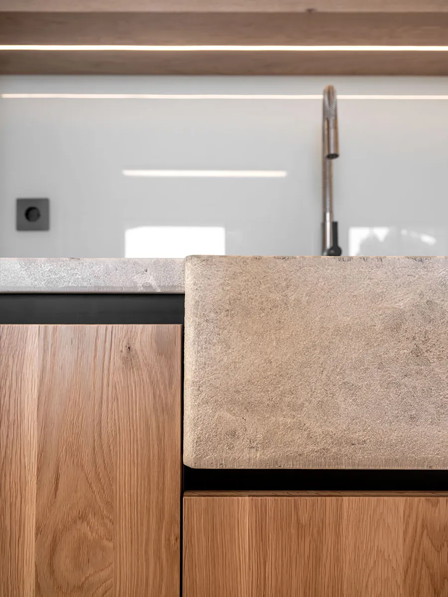 Cuina en tricapa de roure arenat i columnes de DM lacades. Obertura amb Gola lacada. Pedra natural.