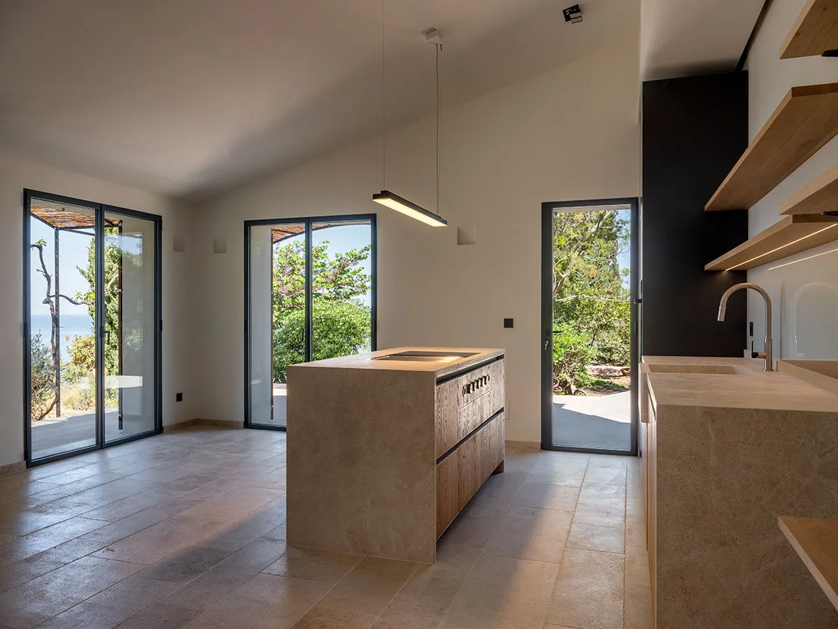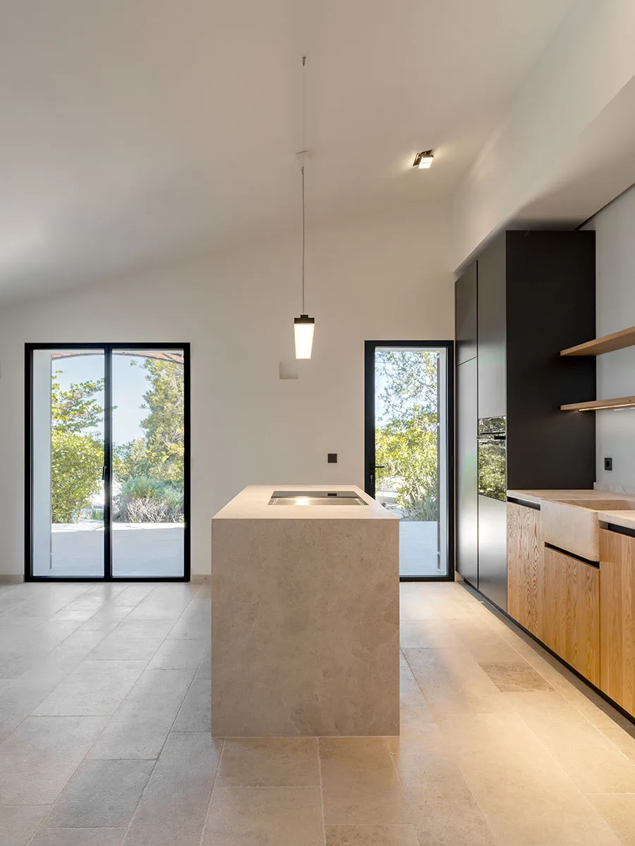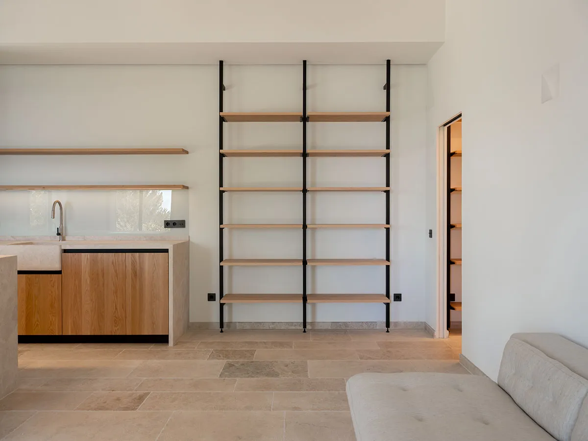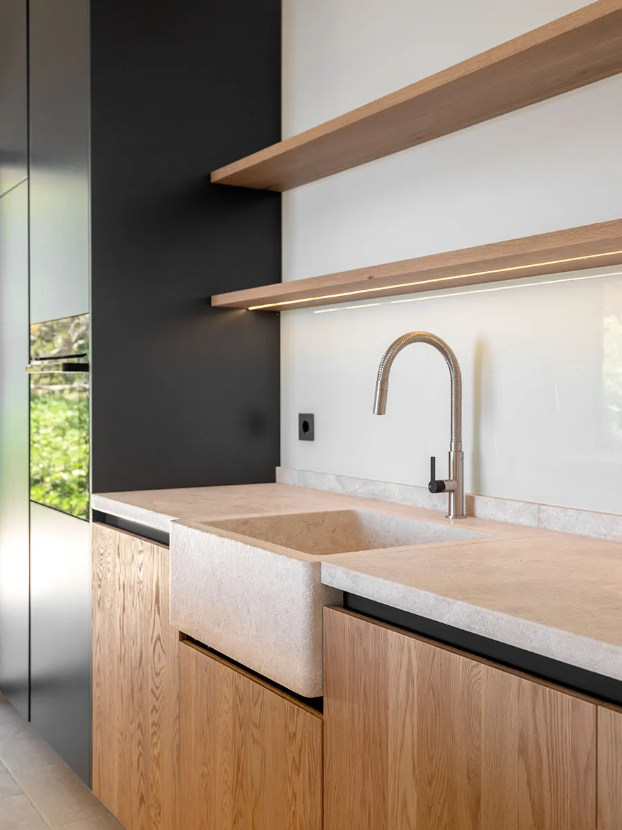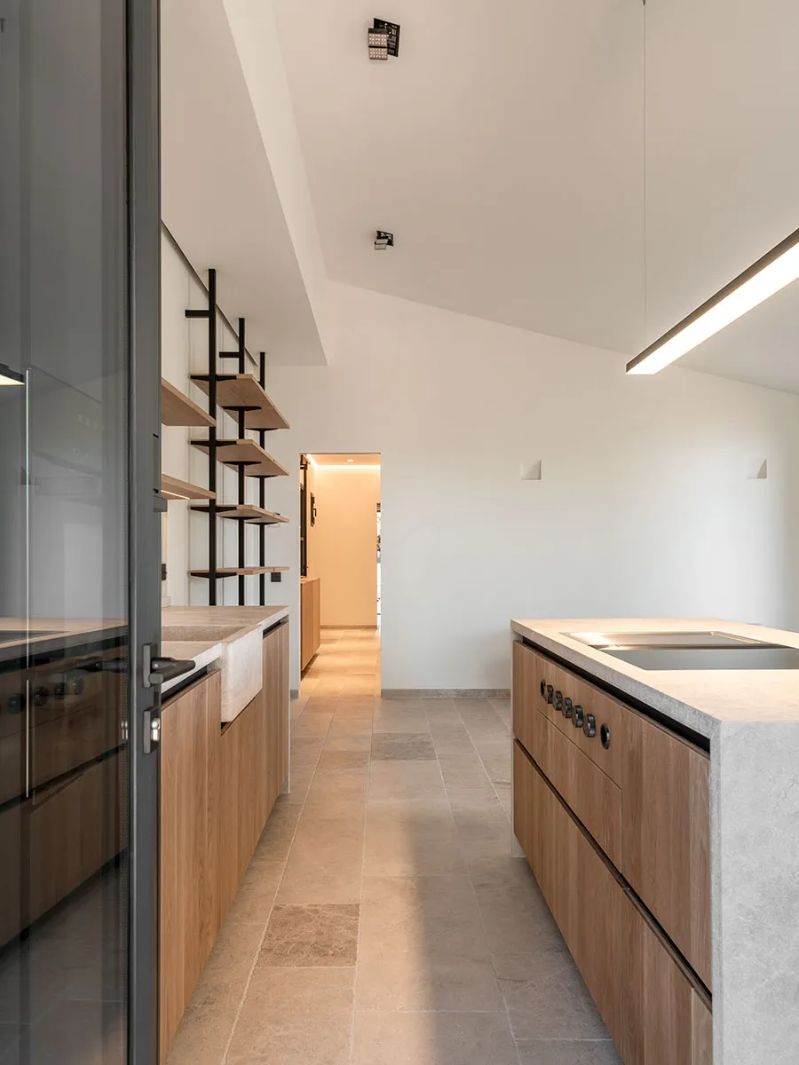 Cuina en tricapa de roure arenat i columnes de DM lacades. Obertura amb Gola lacada. Pedra natural.