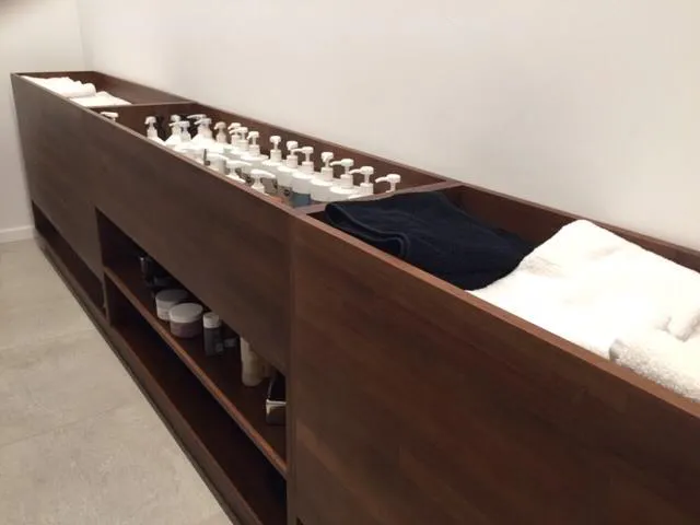 Els mobles s’han fabricat en fusta massissa d’iroko, les portes amb tauler de MDF lacat blanc.