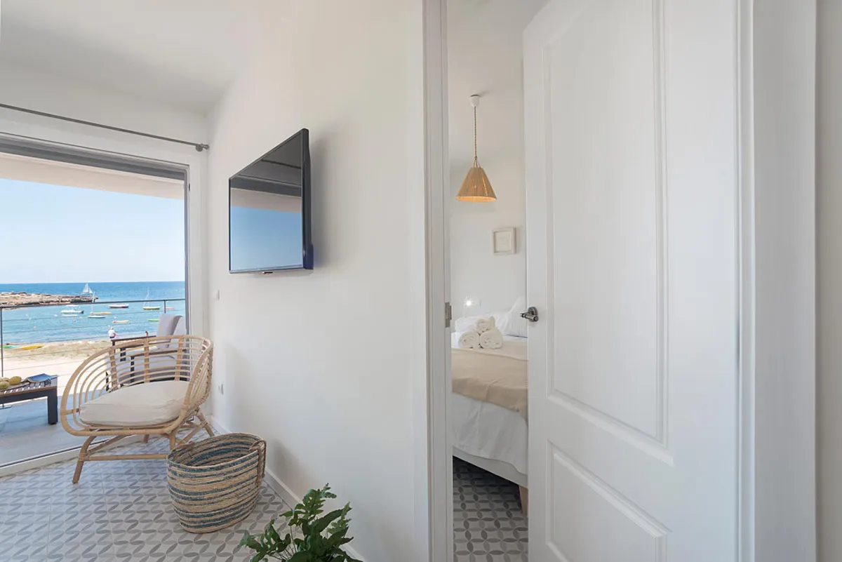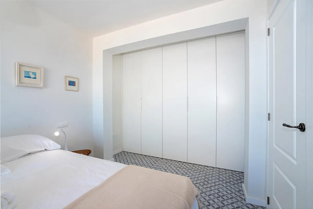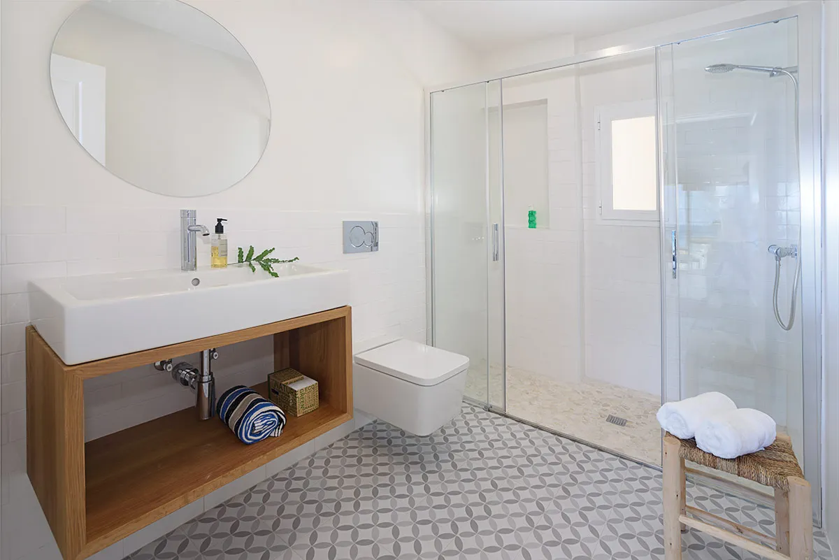 Altres elements fabricats amb fusta: portes, armaris empotrats, lacats de color blanc amb tiradors integrats, moble de bany obert, fet amb fusta de roure, i pica per damunt, de la mateixa mida.