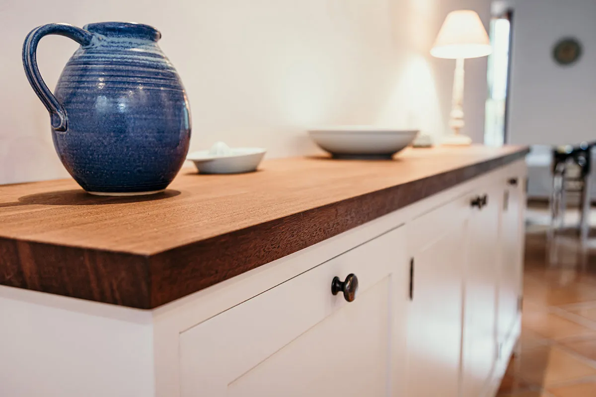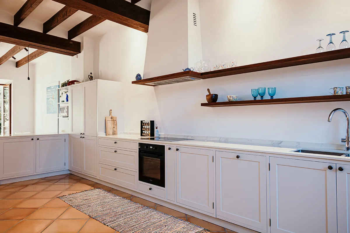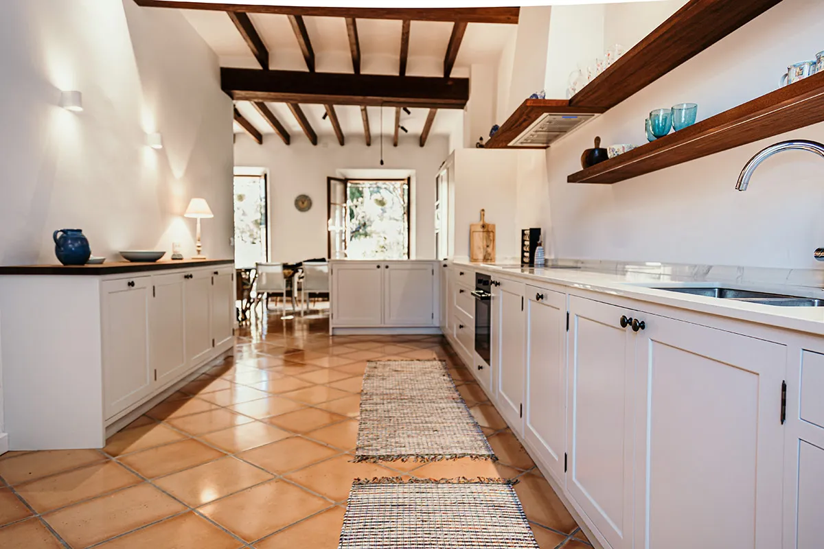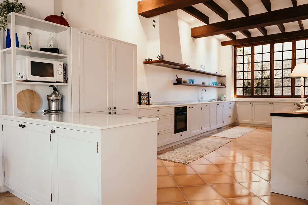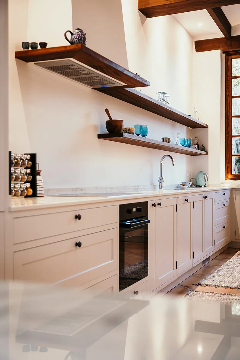 Cuina tradicional d’estil campestre amb fusta de Nord lacada en color. Detalls amb fusta d’iroko i encimera porcelànica amb vetes. Tiradors de color plata vella.