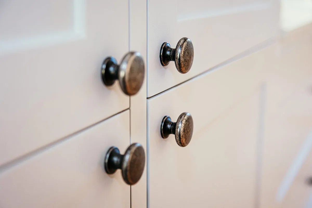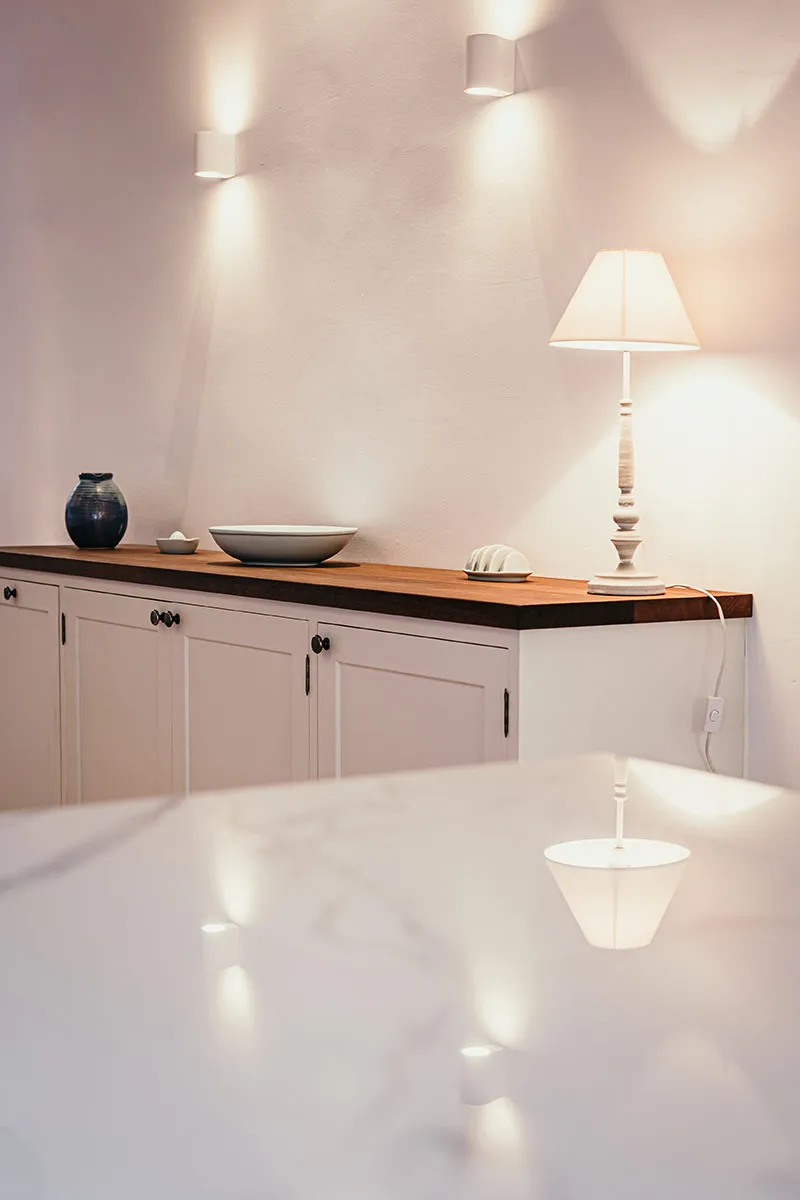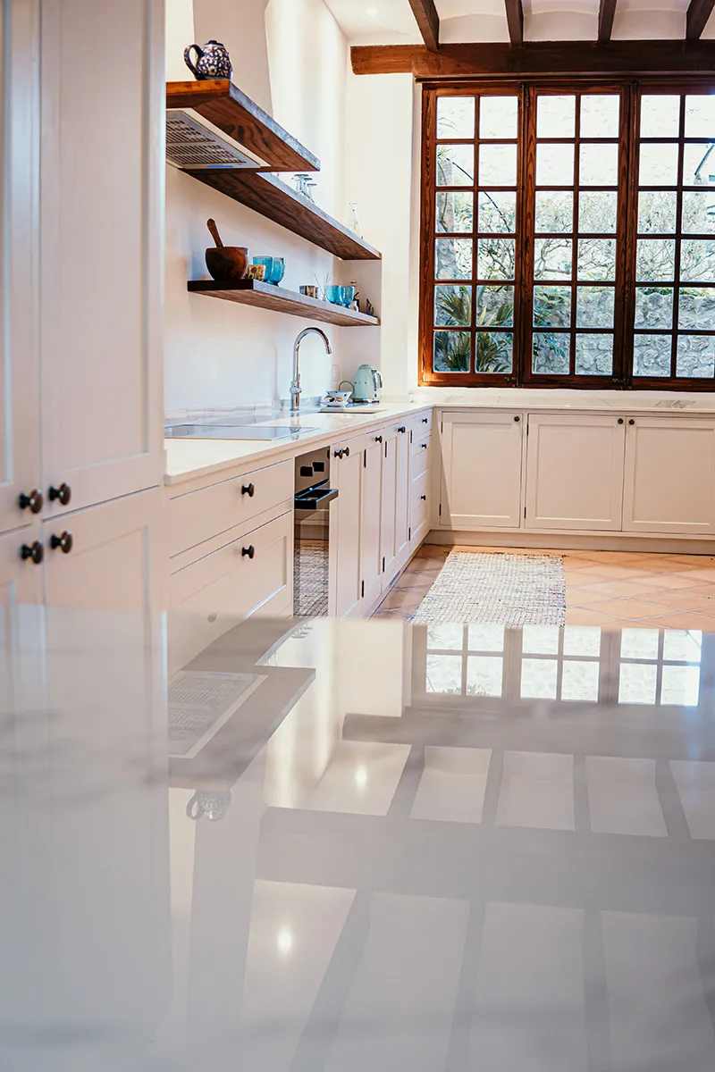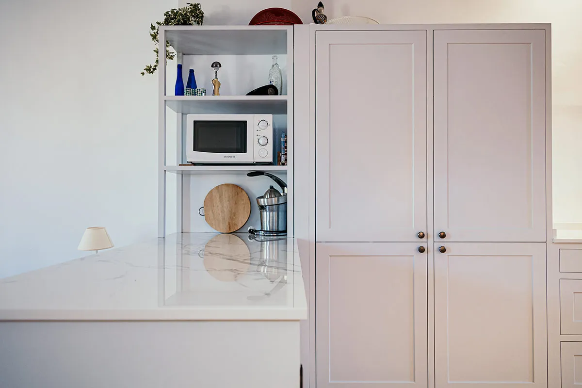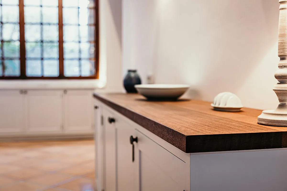 Cuina tradicional d’estil campestre amb fusta de Nord lacada en color. Detalls amb fusta d’iroko i encimera porcelànica amb vetes. Tiradors de color plata vella.