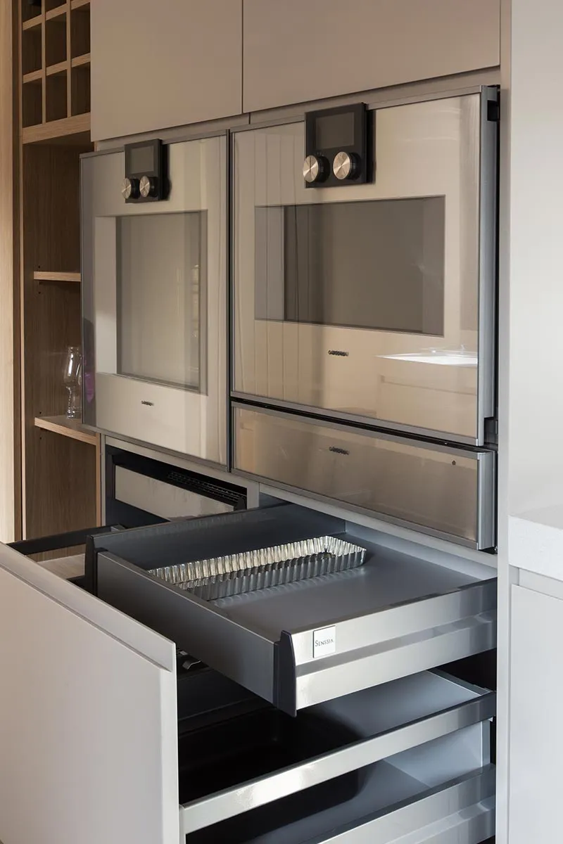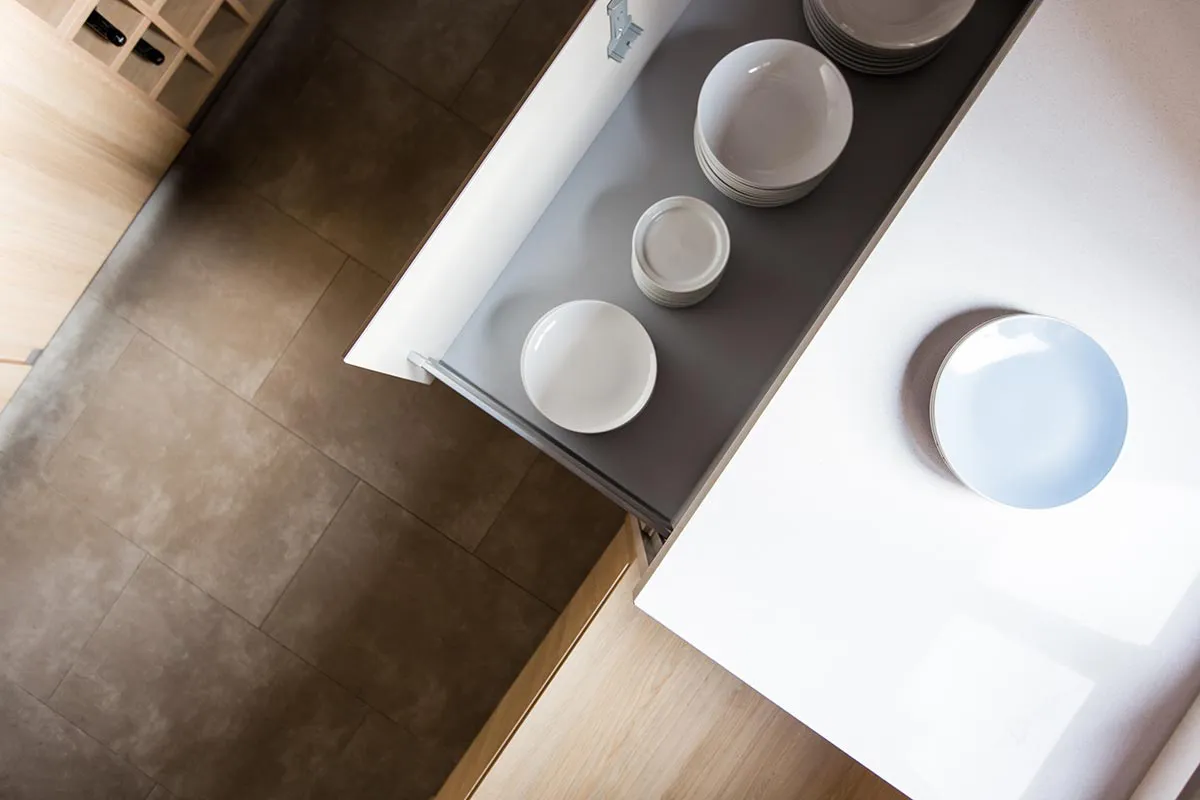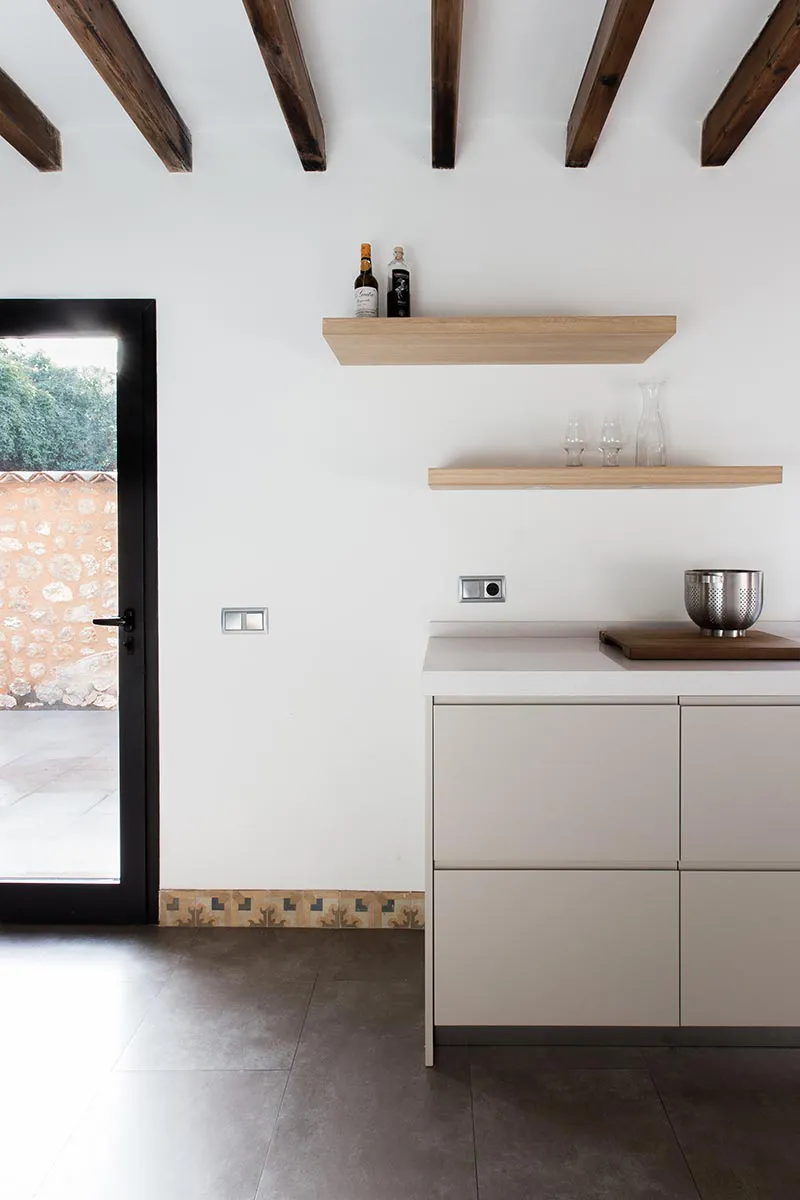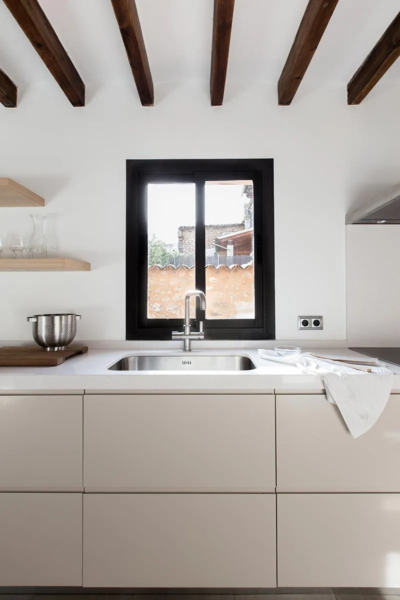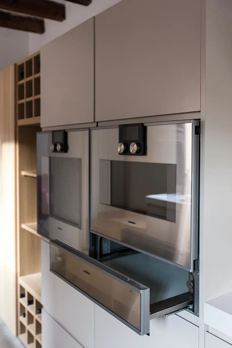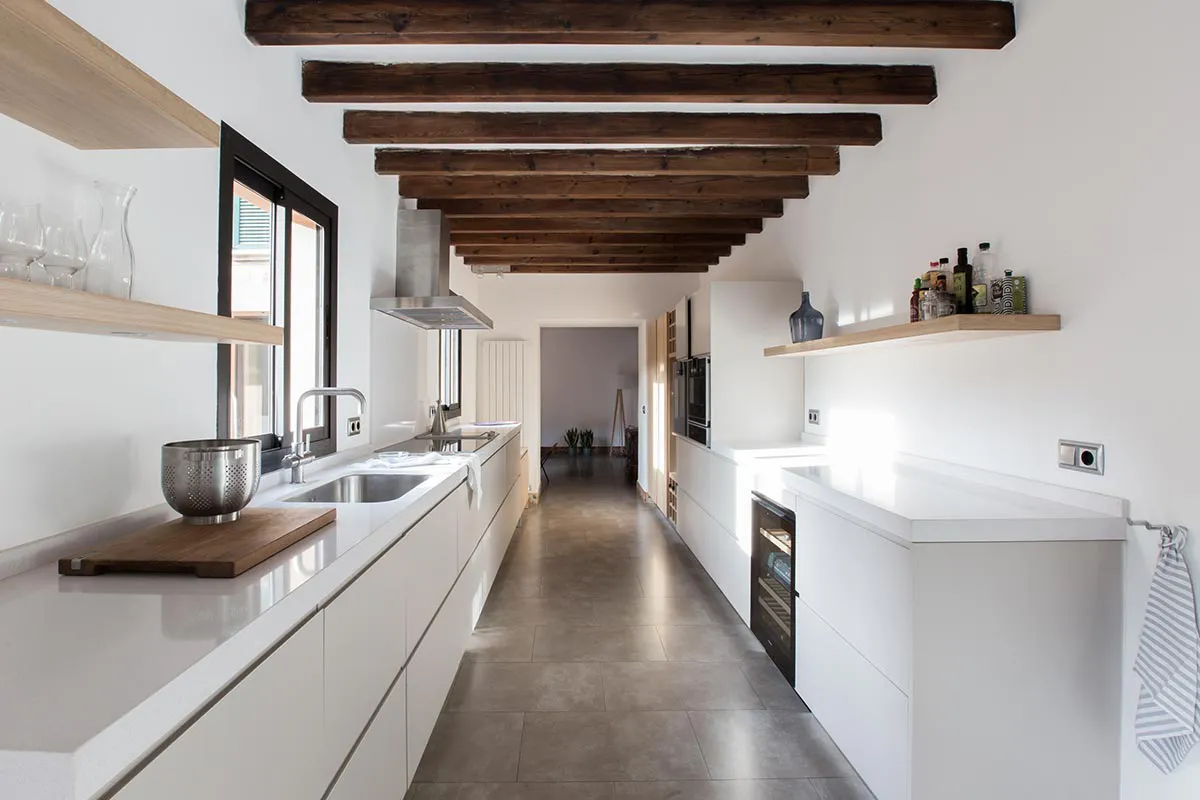 Cuina Modular realitzada en Melamina de Roure i Lacat Blanc amb tirador integrat “uñero”.