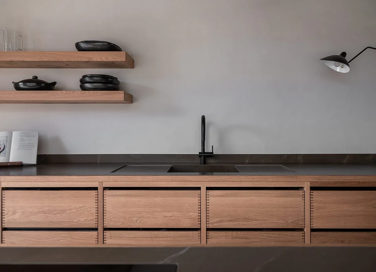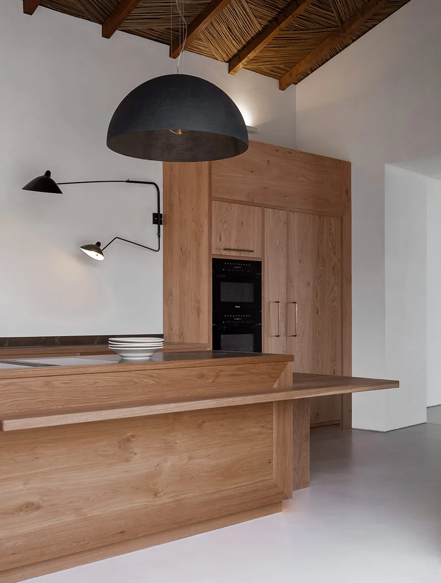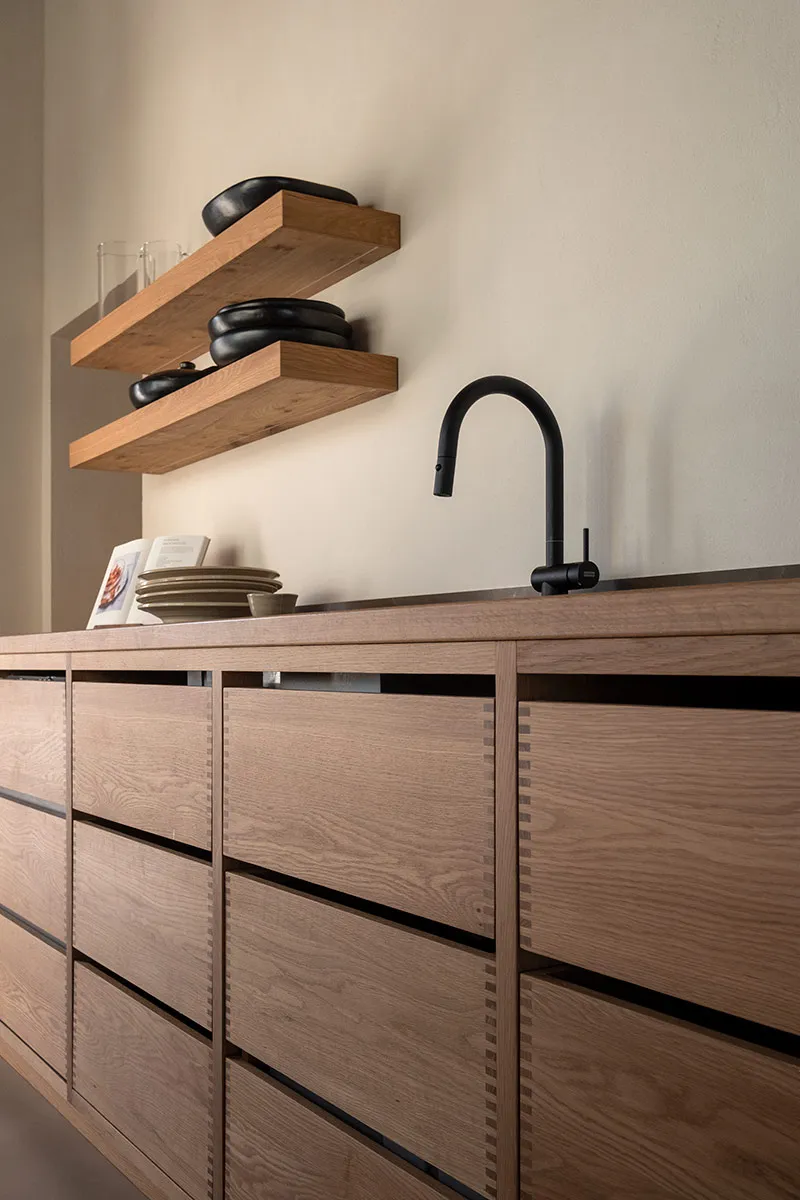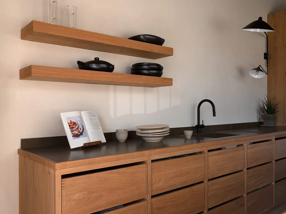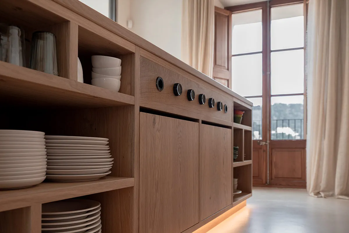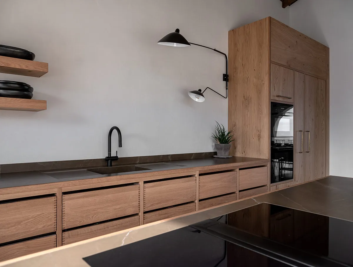 Cuina amb coa d’oronella, fabricada artesanalment en roure vintage.