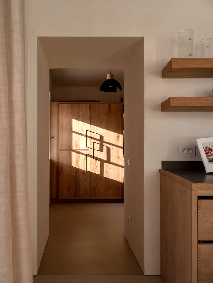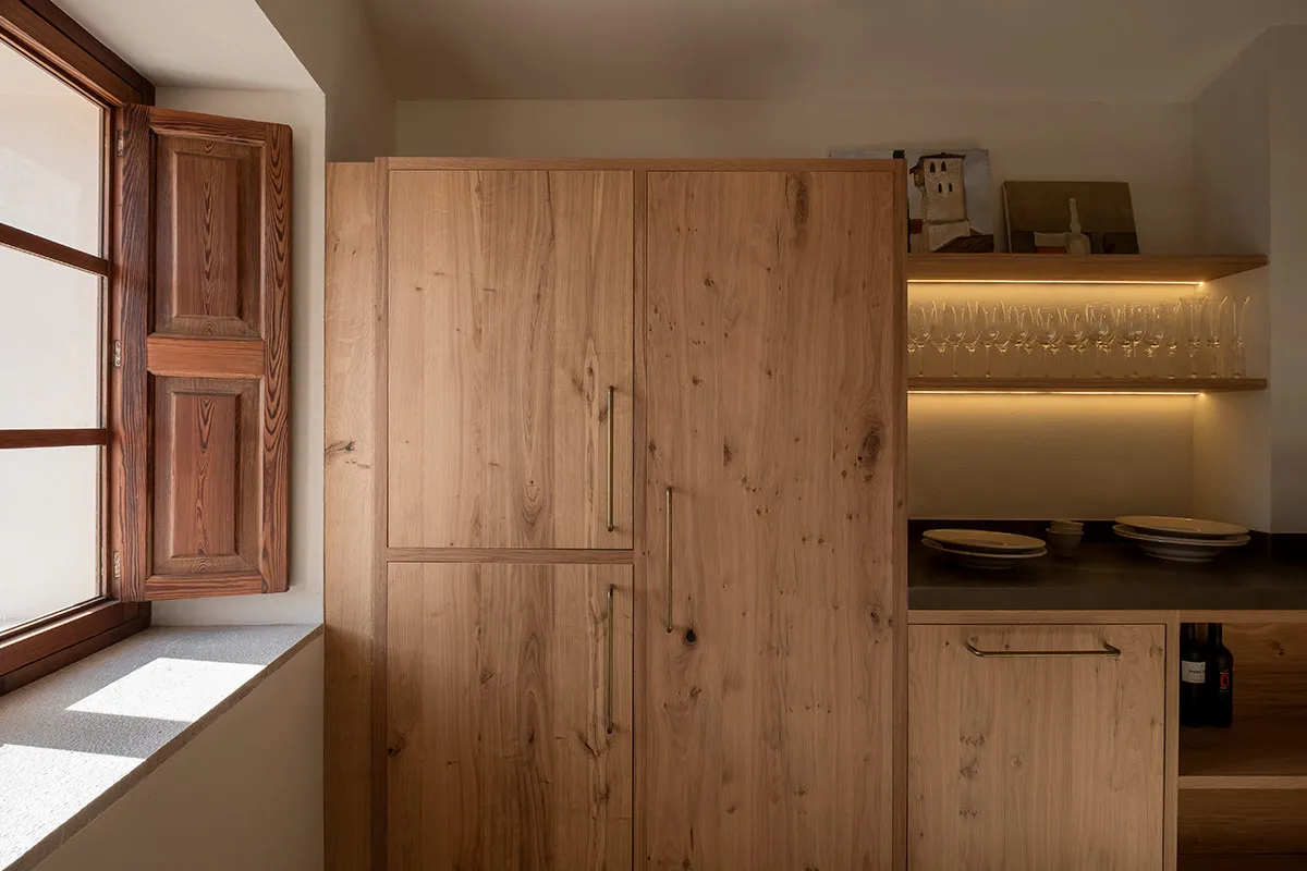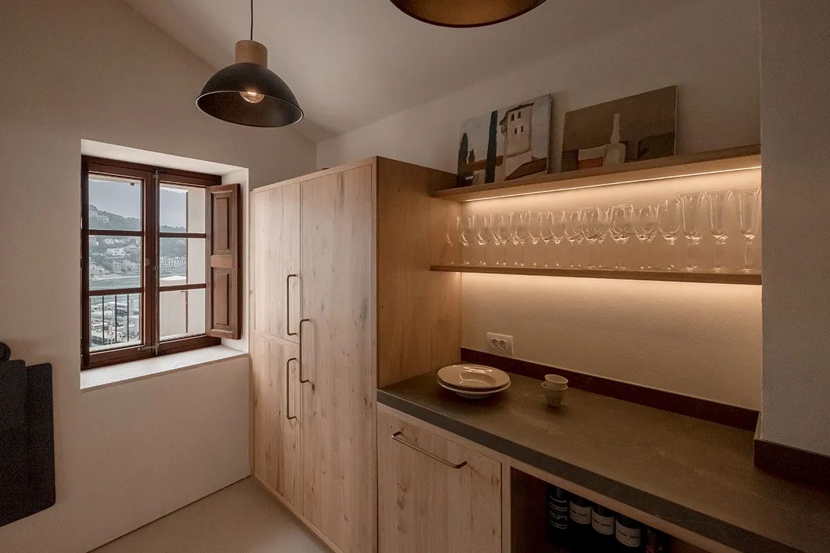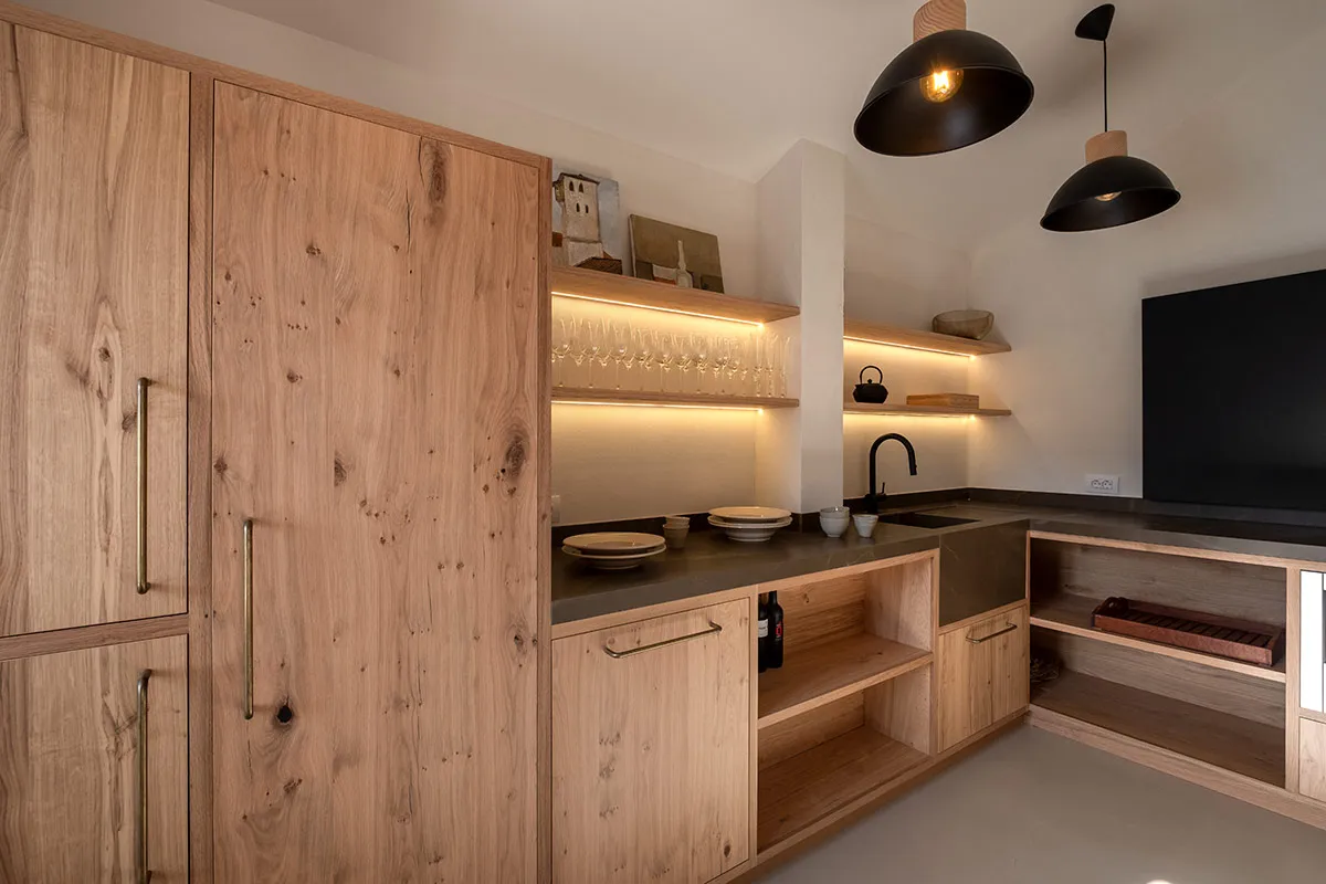 Cuina fabricada 100% amb roure vintage i tiradors artesanals de llautó fets a Mallorca.