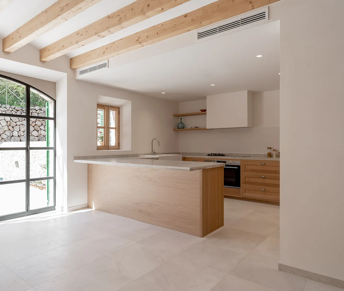 Cuina amb península i paret de columnes fabricada al nostre taller amb fusta de roure natural. L’encimera de la cuina és de quarsita natural model Perla Venata i pica de porcellana.