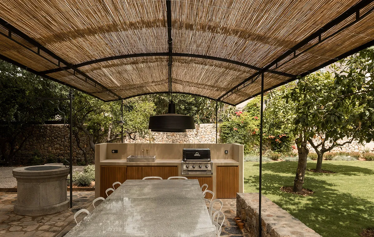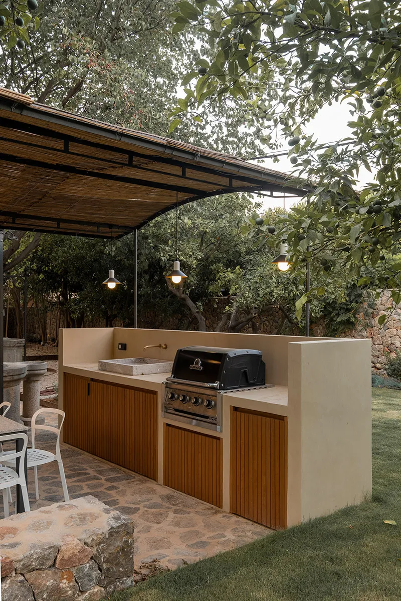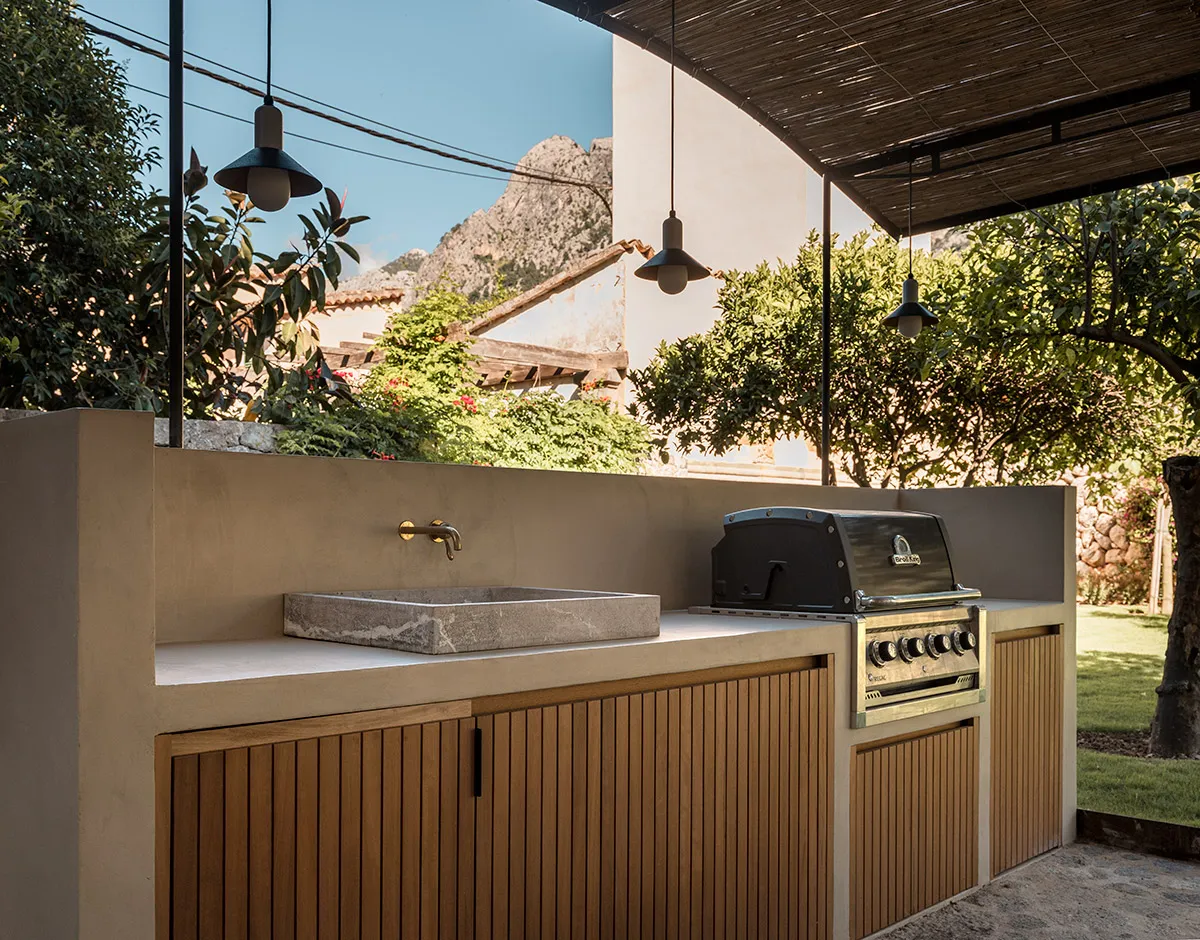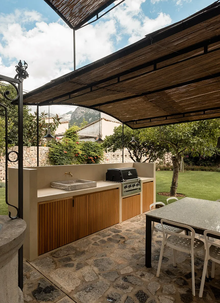 Cuina exterior en fusta d’Iroko enllistonada i totalment integrada dins l’estructura d’obra.