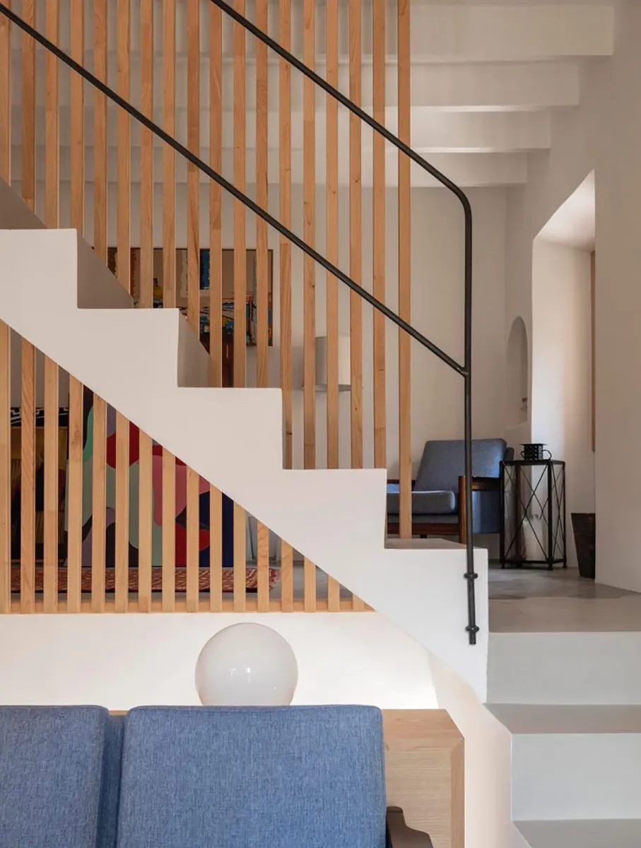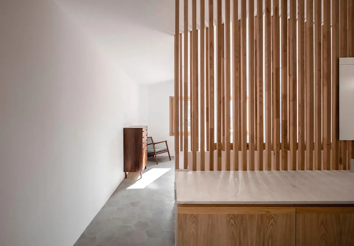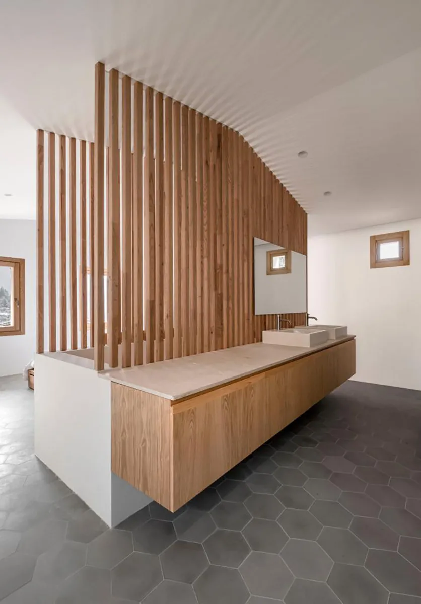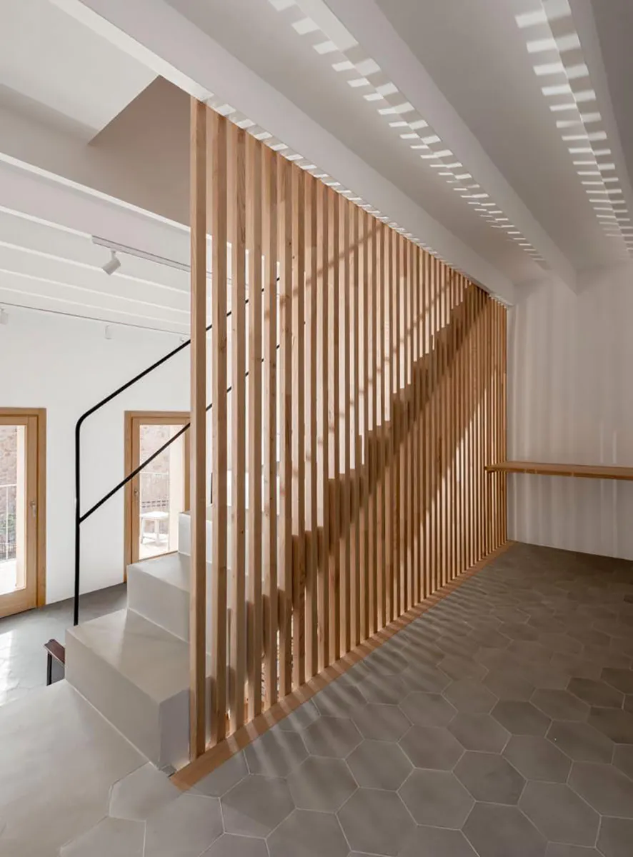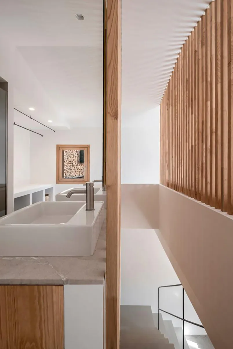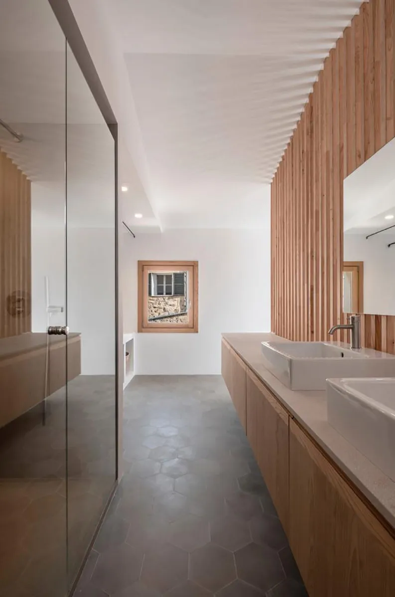 Projecte fet en fusta de castanyer. Estructura de lames que a la vegada fa la funció de divisions d’espais. Finestres de castanyer en perfil europeu. Moble de bany en fusta de castanyer amb tirador integrat de fusta massissa i pedra de Biniamar. Mobiliari en fusta massissa de castanyer. Un projecte espectacular.