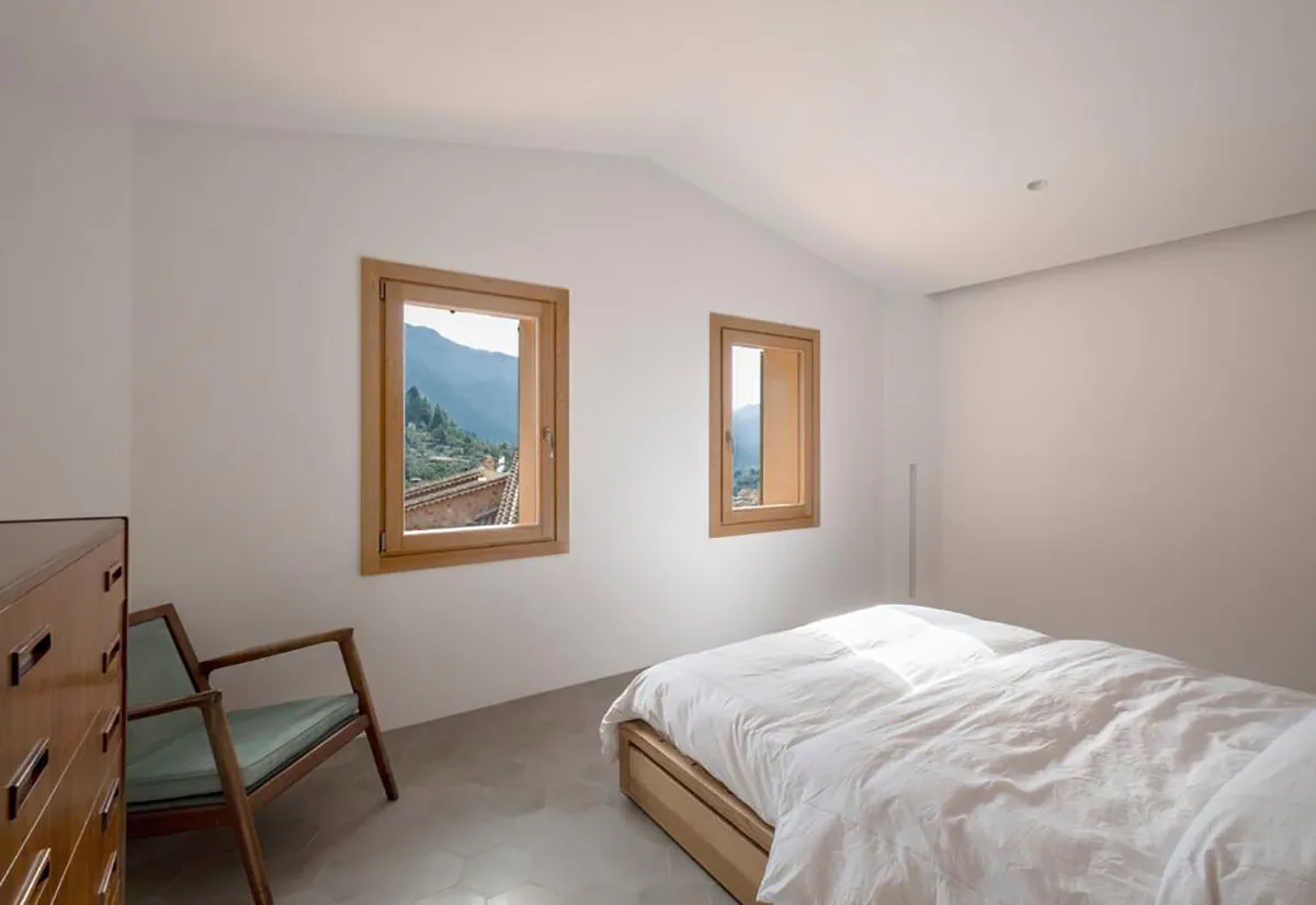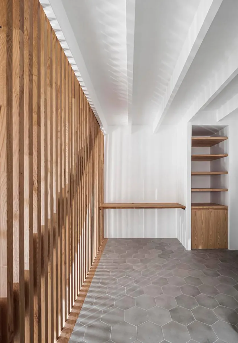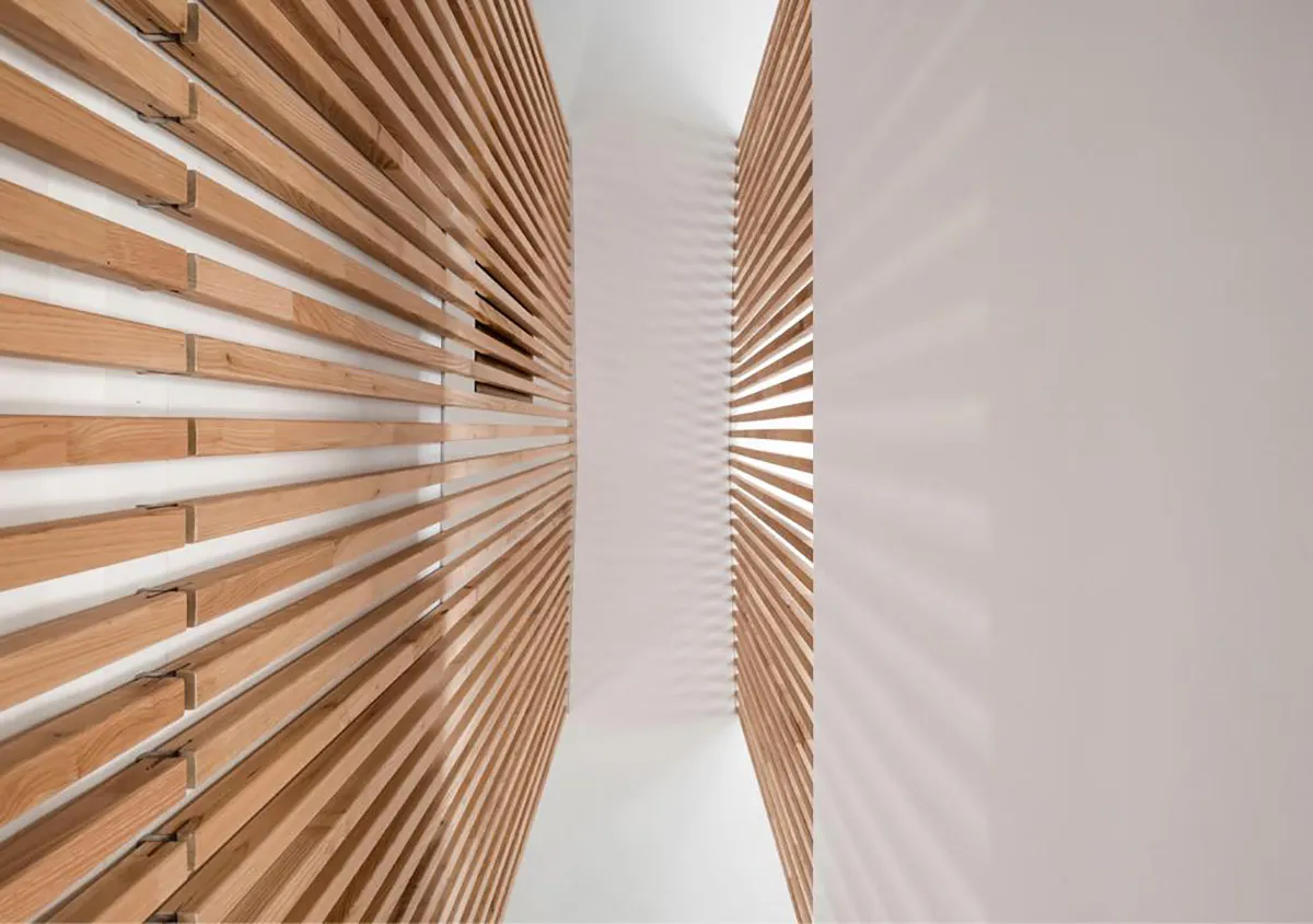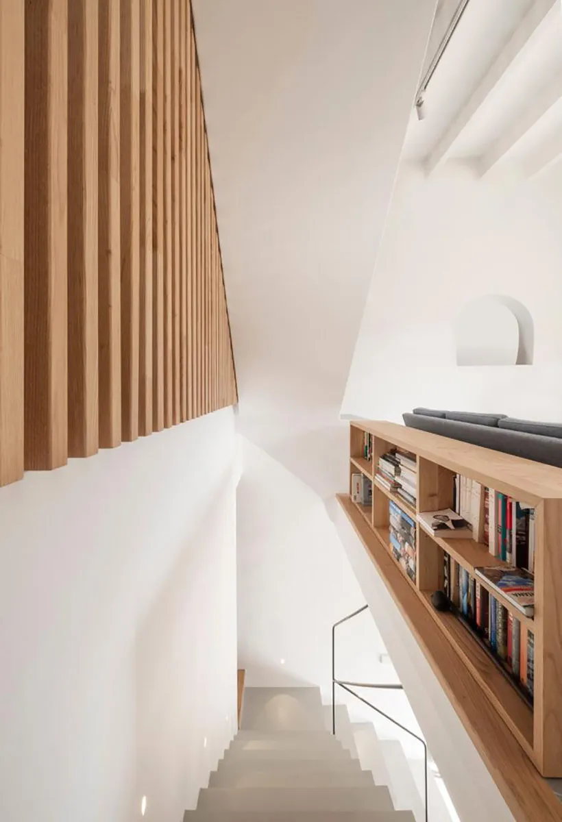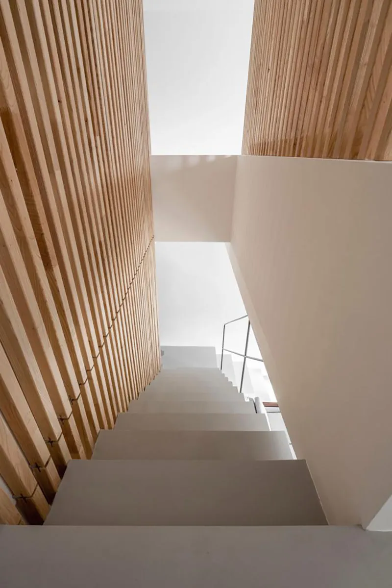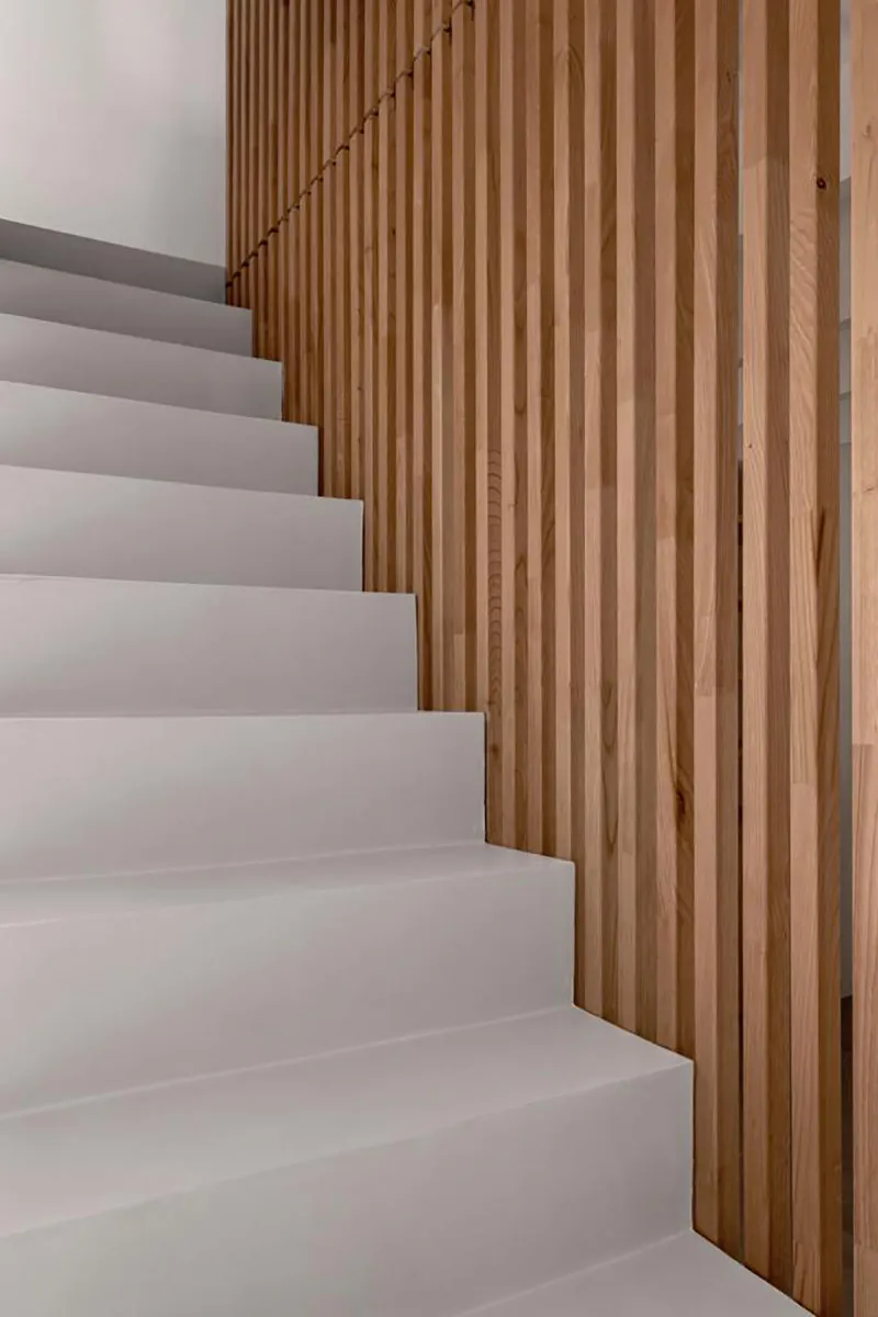 Projecte fet en fusta de castanyer. Estructura de lames que a la vegada fa la funció de divisions d’espais. Finestres de castanyer en perfil europeu. Moble de bany en fusta de castanyer amb tirador integrat de fusta massissa i pedra de Biniamar. Mobiliari en fusta massissa de castanyer. Un projecte espectacular.
