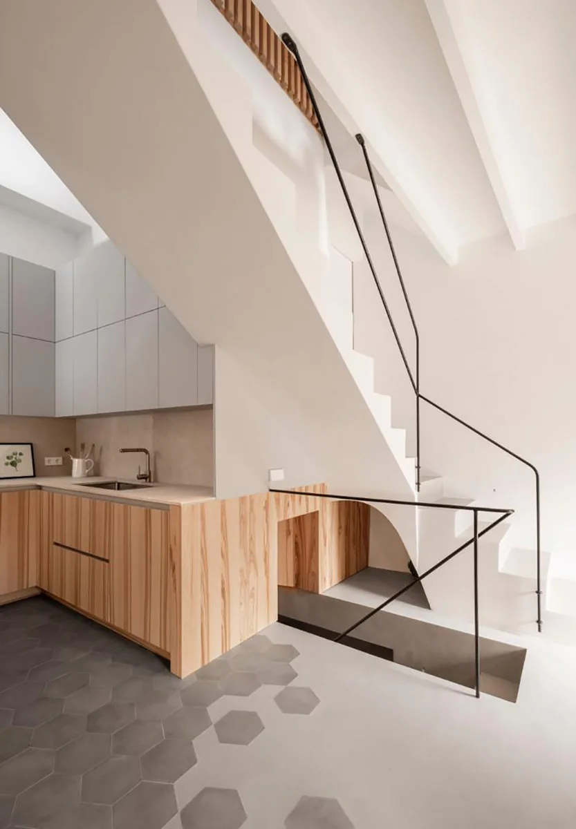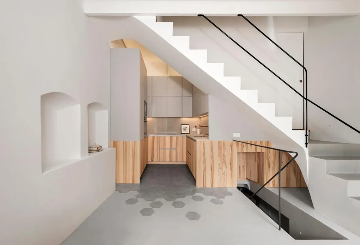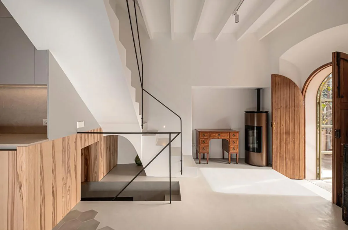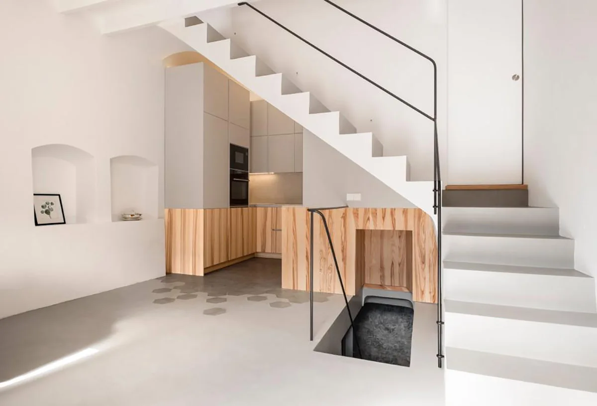 Cuina combinada en fusta de fleix olivato i laminat Fènix gris clar. Cuina amb doble altura de mobles alts per aprofitar al màxim l’espai de la cuina. Encimera en pedra de Biniamar.