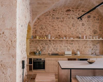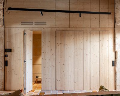 Cocina exterior en madera de Iroko alistonada y totalmente integrada dentro de la estructura de obra.