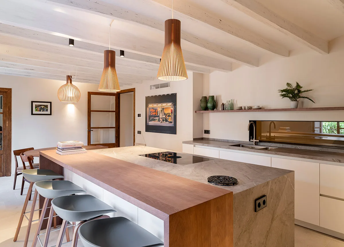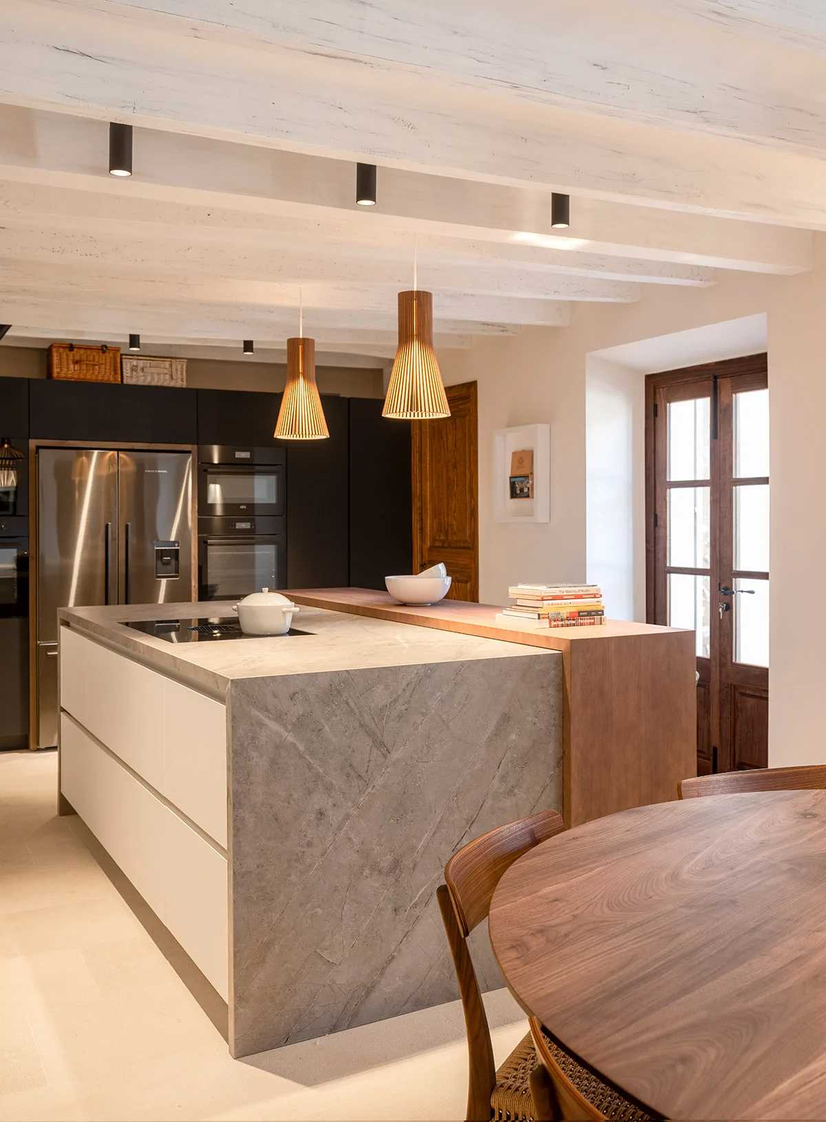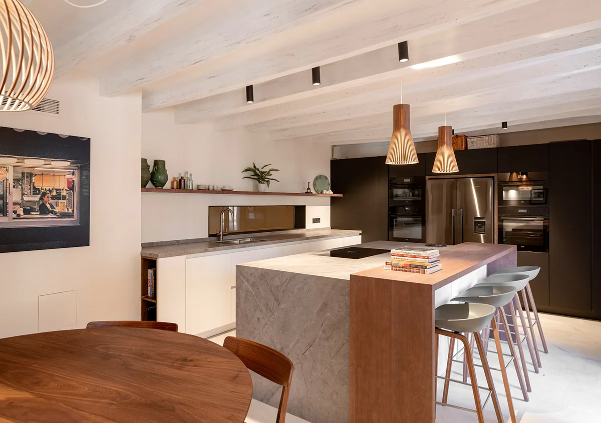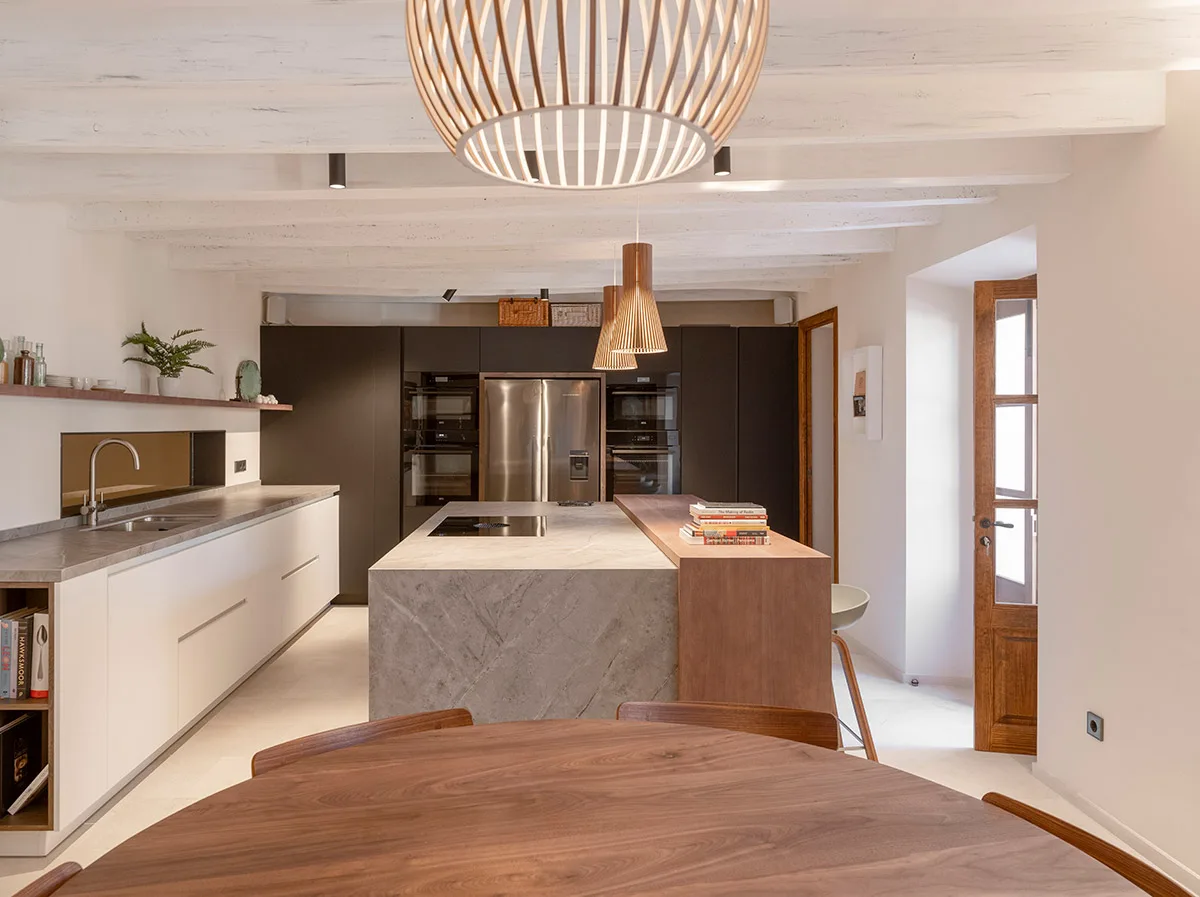 La cocina principal fusiona modernidad y sofisticación. Columnas con acabado laminado Fénix y muebles bajos en laca blanca. La encimera de Dekton Vera aporta un toque de lujo, mientras que los detalles en madera de roble proporcionan calidez y personalidad.
