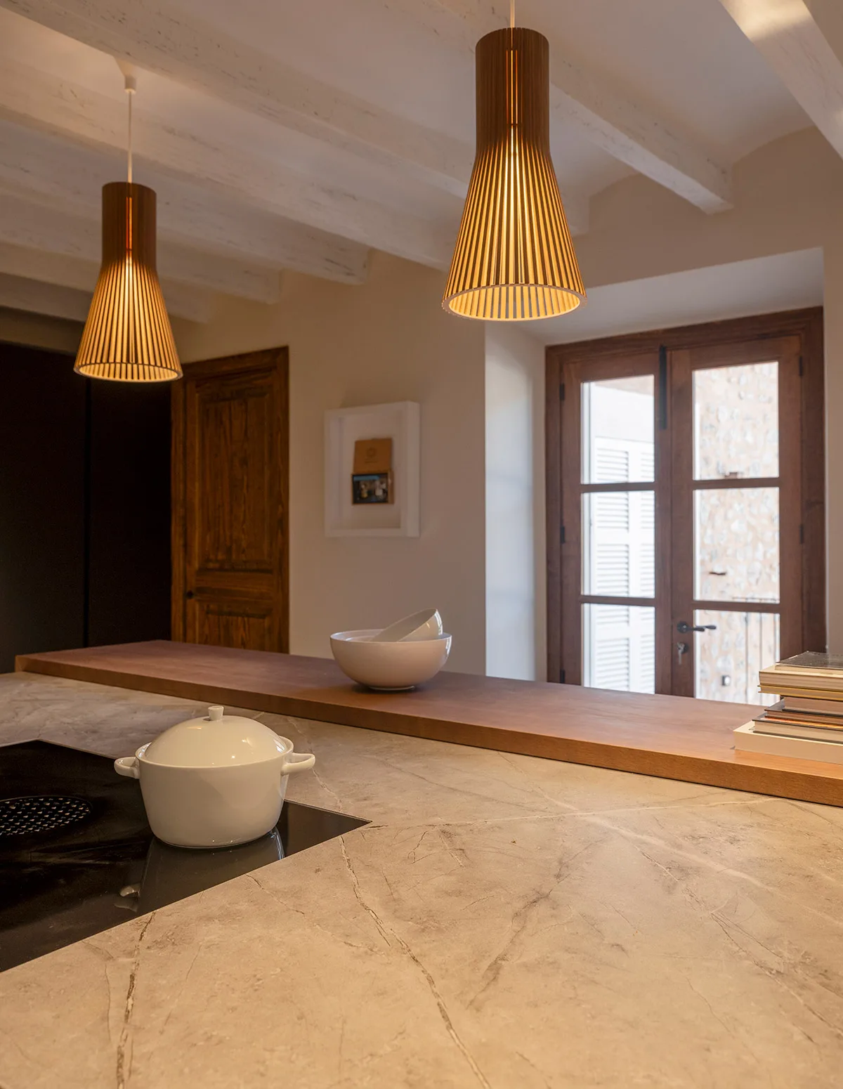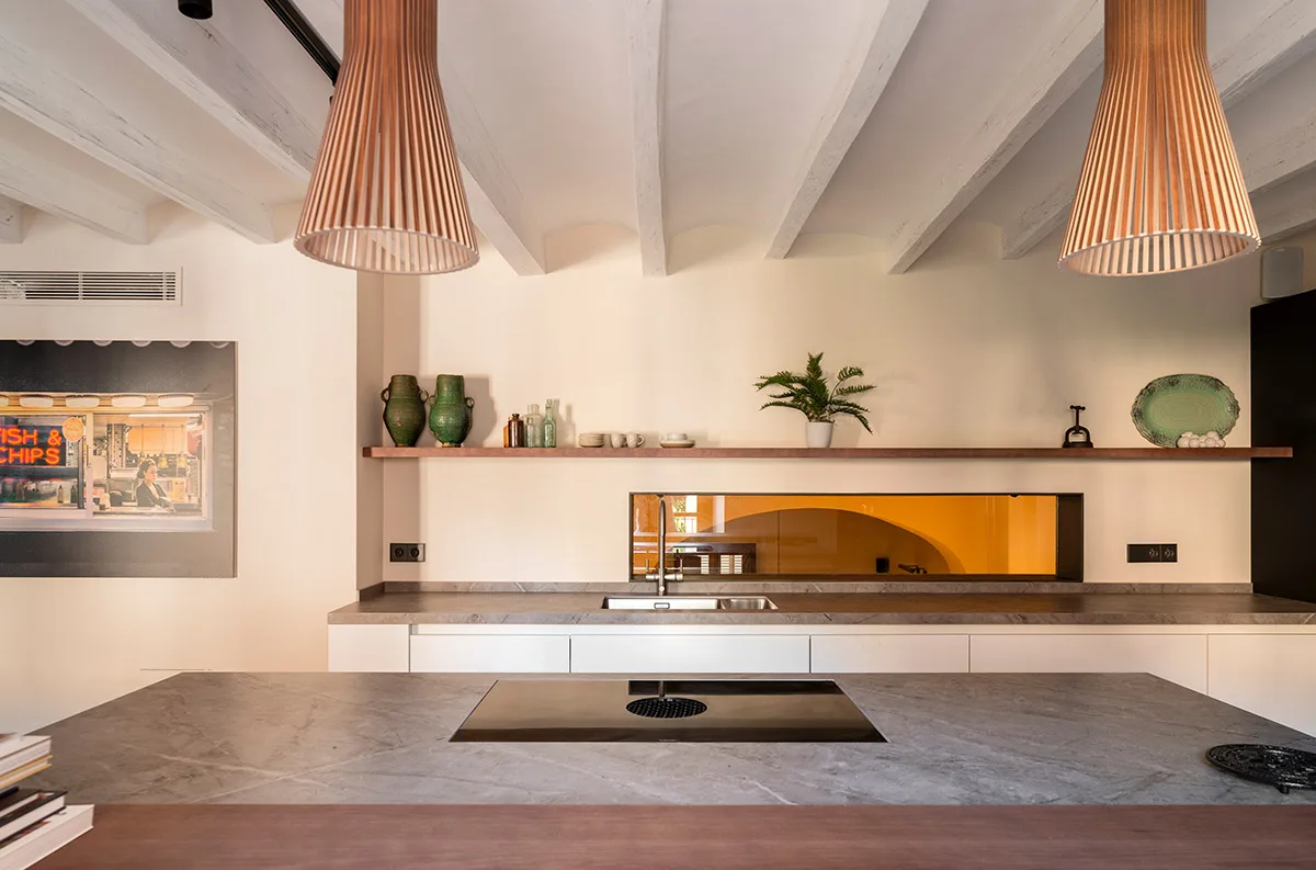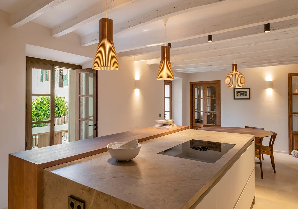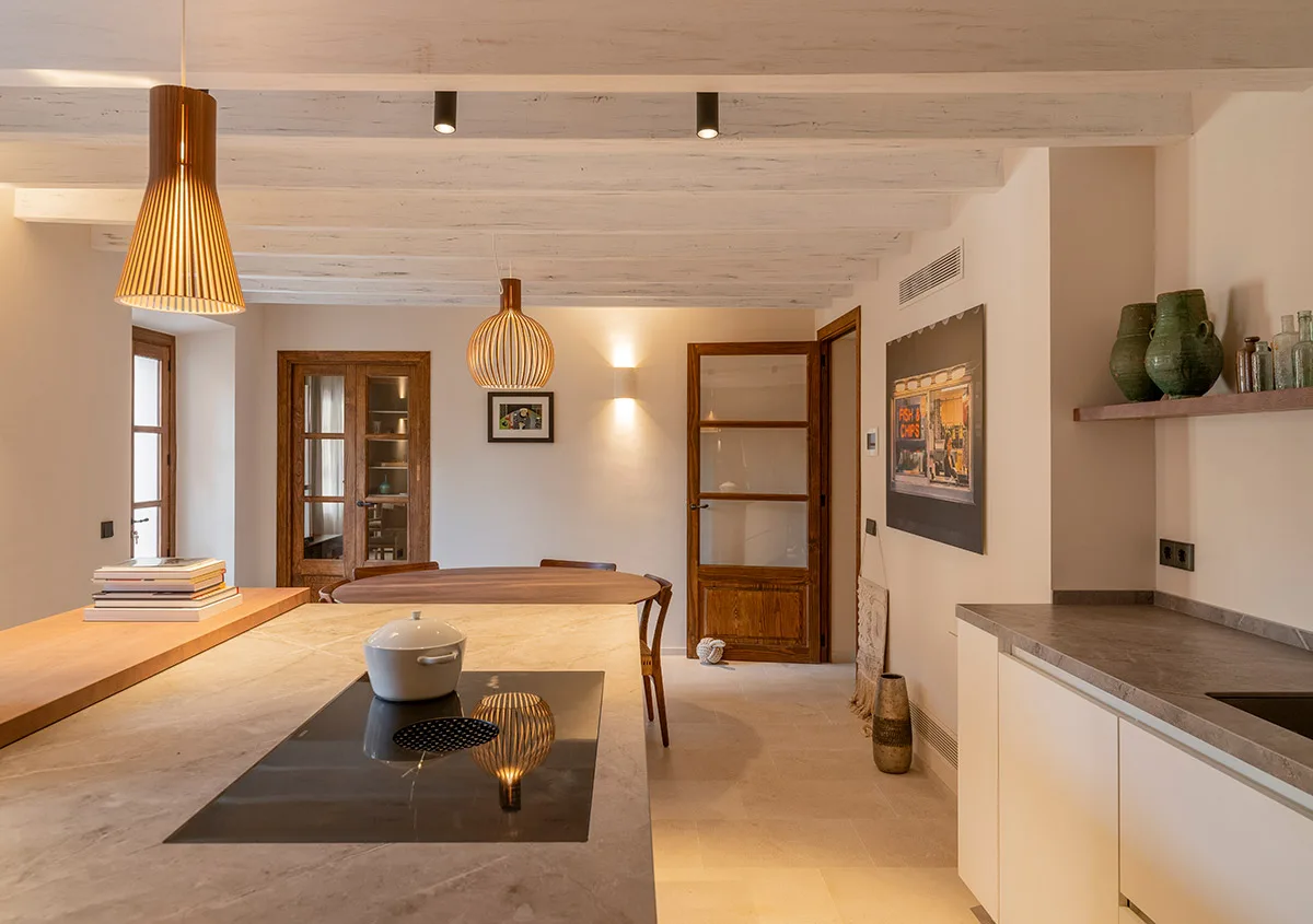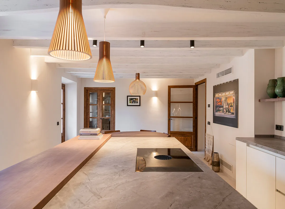 La cocina principal fusiona modernidad y sofisticación. Columnas con acabado laminado Fénix y muebles bajos en laca blanca. La encimera de Dekton Vera aporta un toque de lujo, mientras que los detalles en madera de roble proporcionan calidez y personalidad.