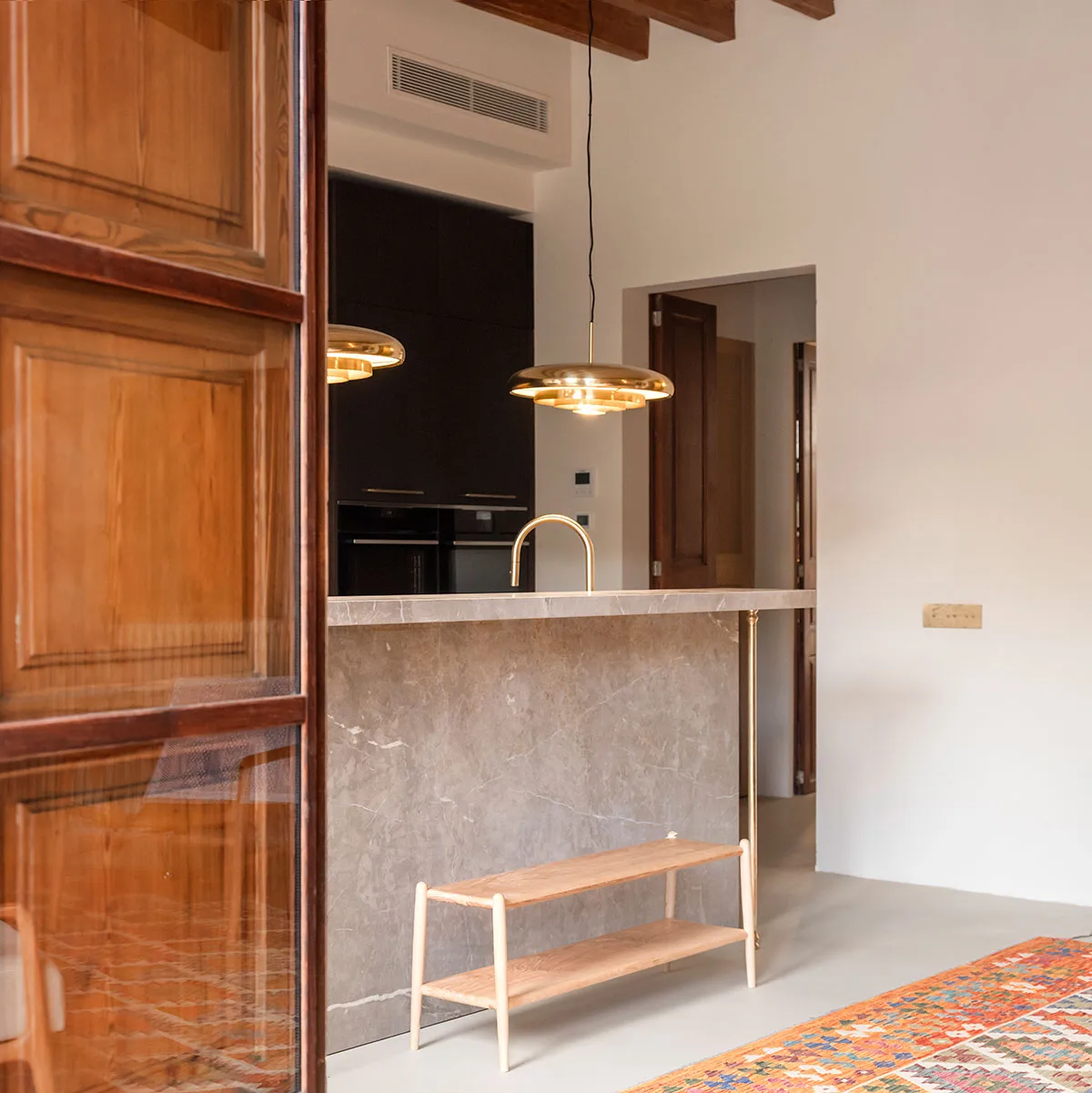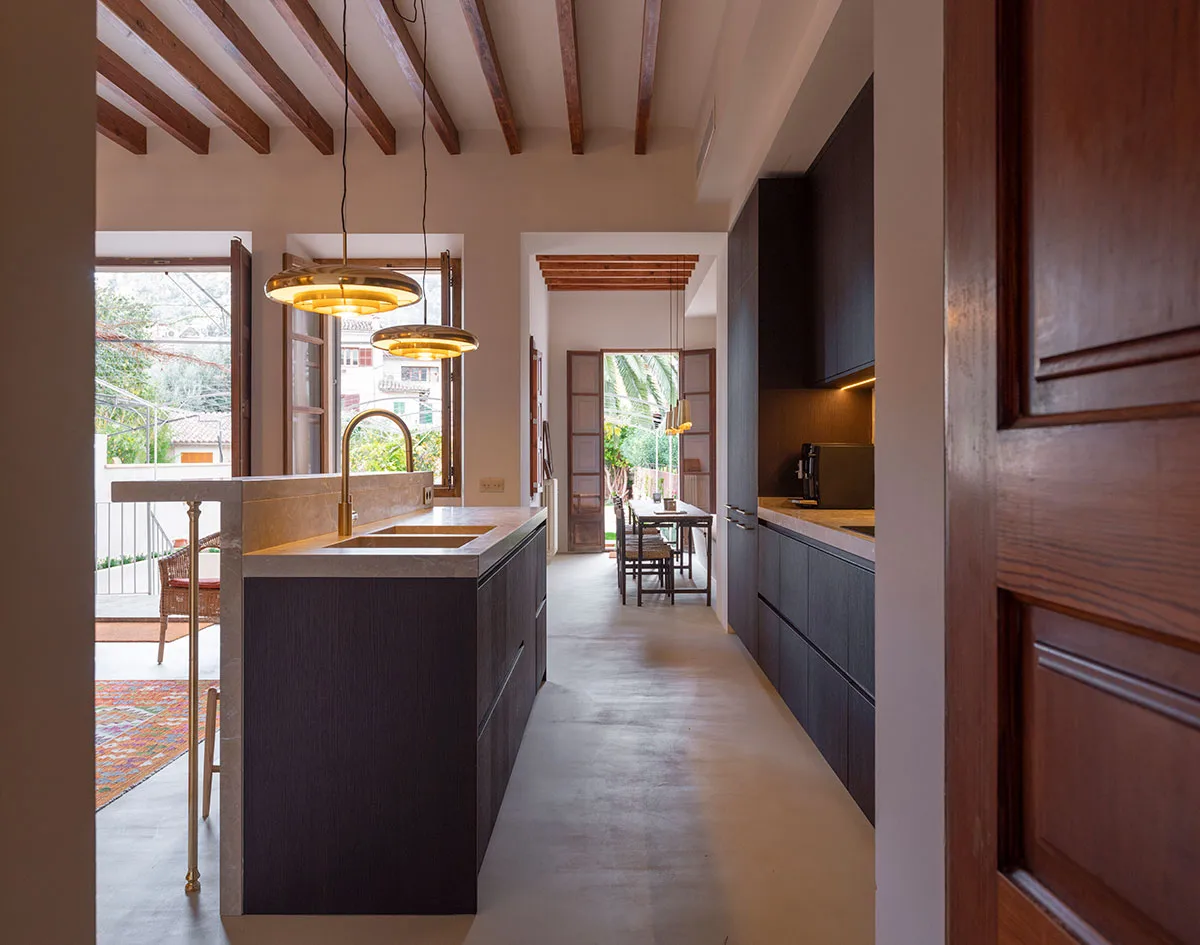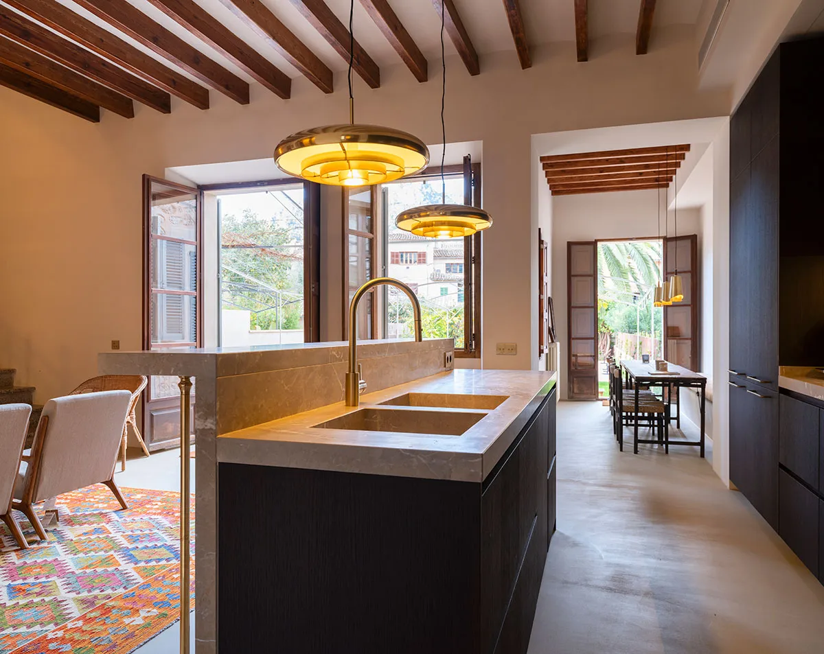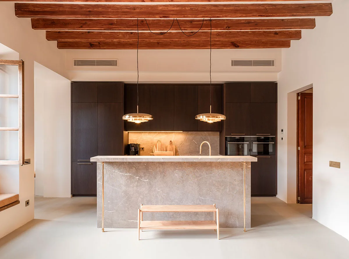 Cocina con diseño enmarcado con dos torres a los lados y una isla. Los muebles están fabricados en madera de roble tintado, acompañados de una encimera de piedra natural Biniamar. Los tiradores de latón añaden un toque refinado y resaltan los detalles de esta fantástica cocina.