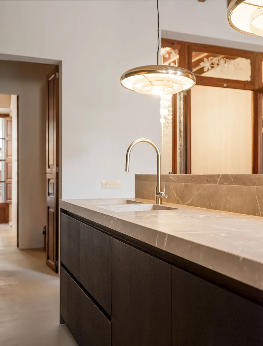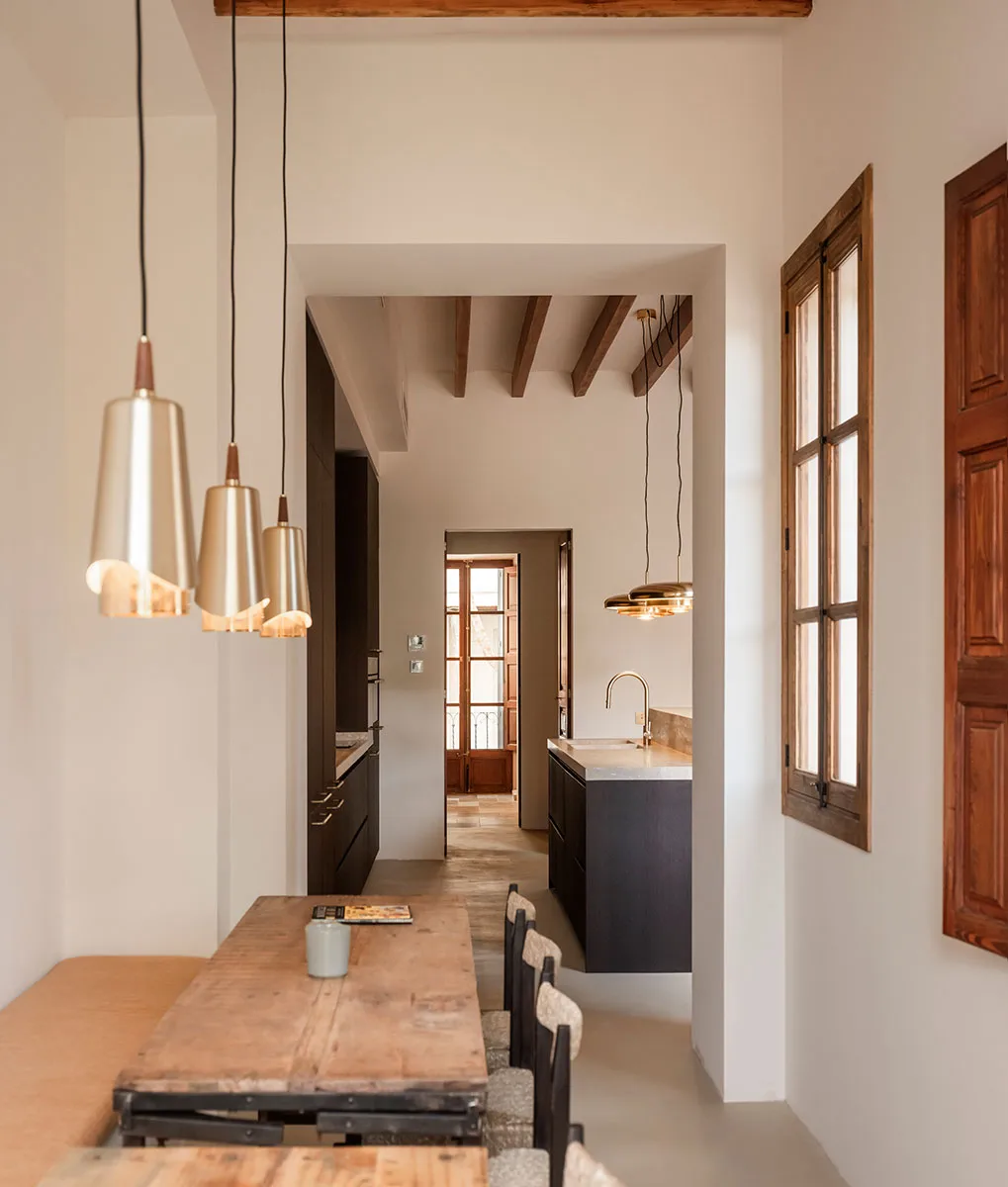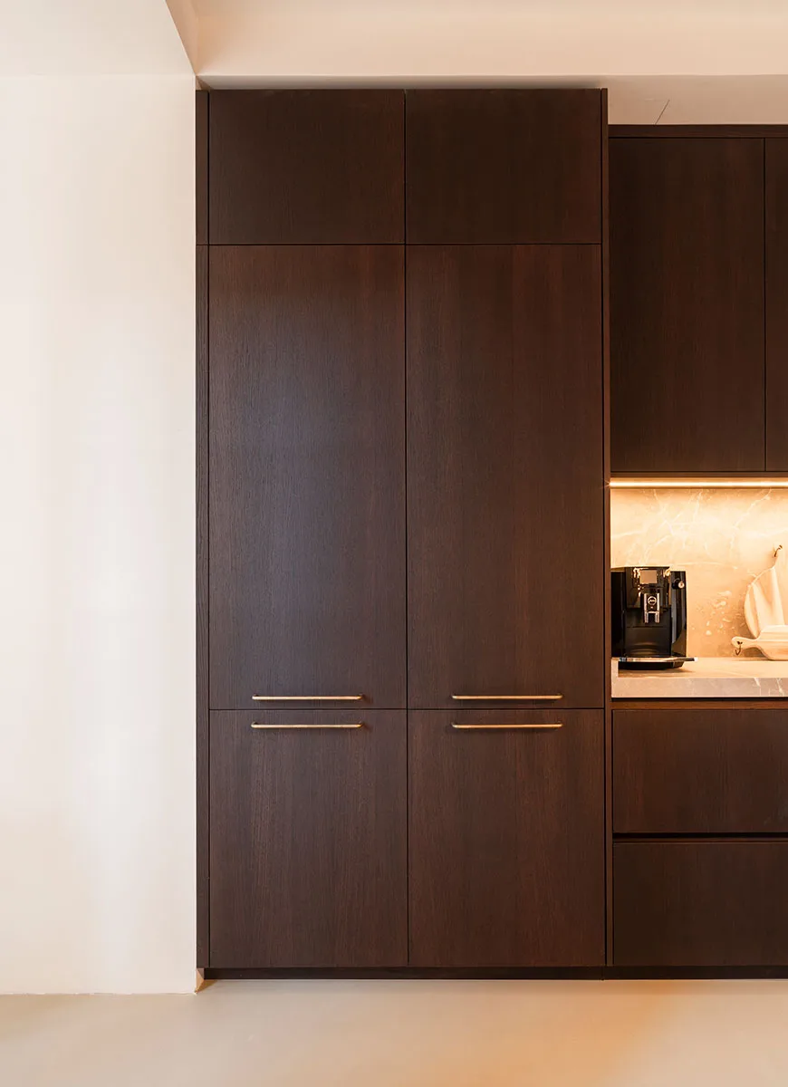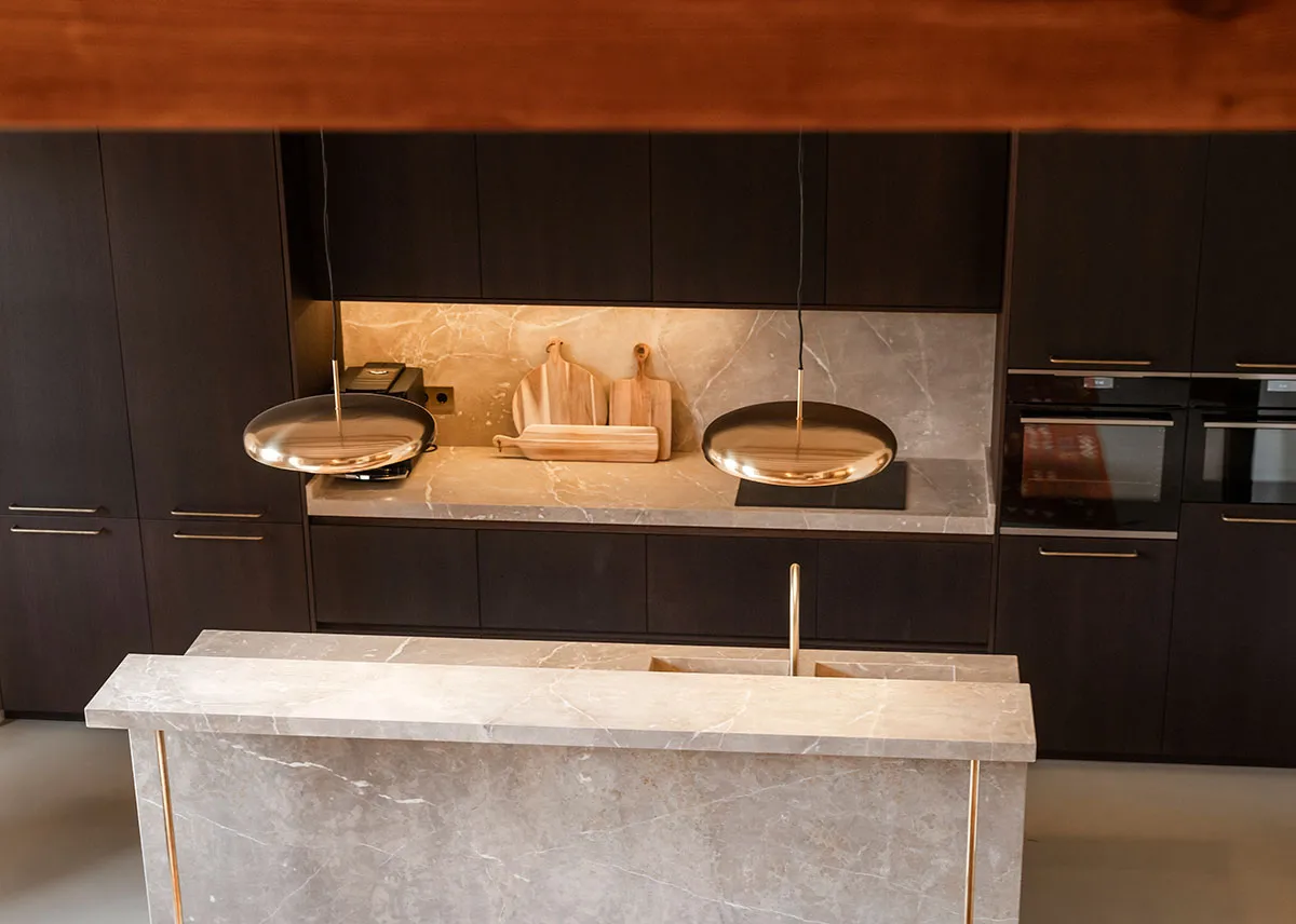Cocina con diseño enmarcado con dos torres a los lados y una isla. Los muebles están fabricados en madera de roble tintado, acompañados de una encimera de piedra natural Biniamar. Los tiradores de latón añaden un toque refinado y resaltan los detalles de esta fantástica cocina.